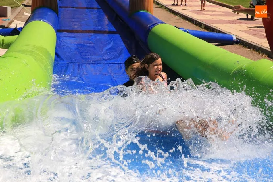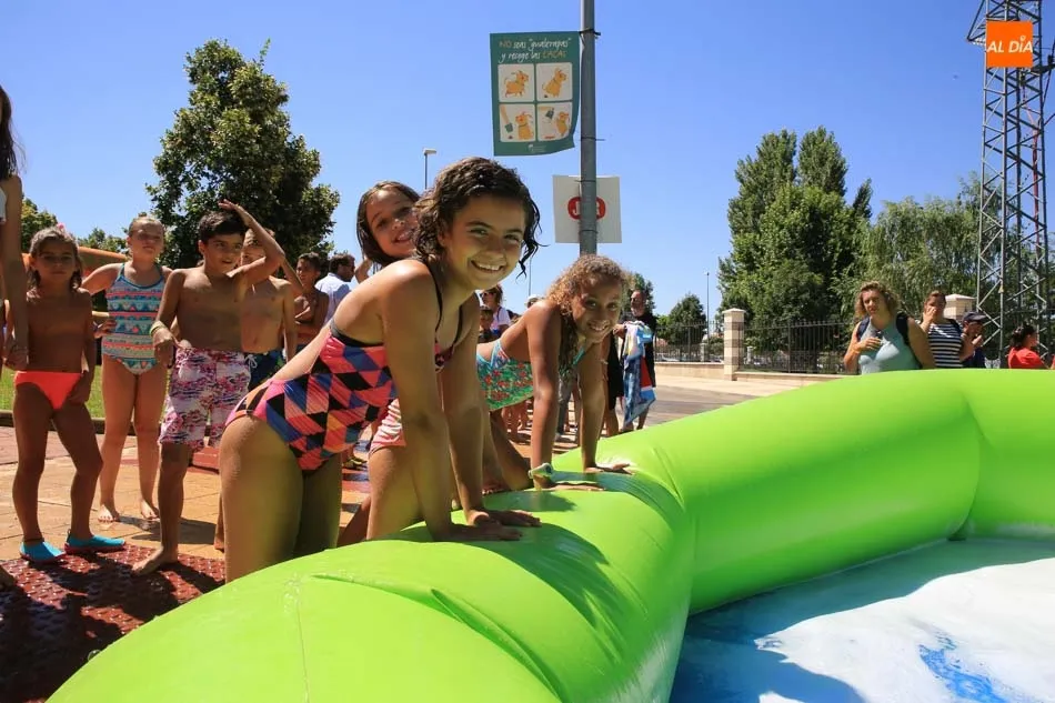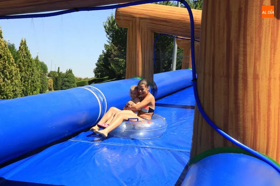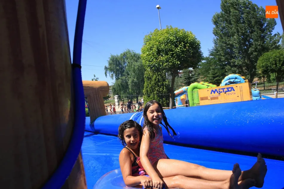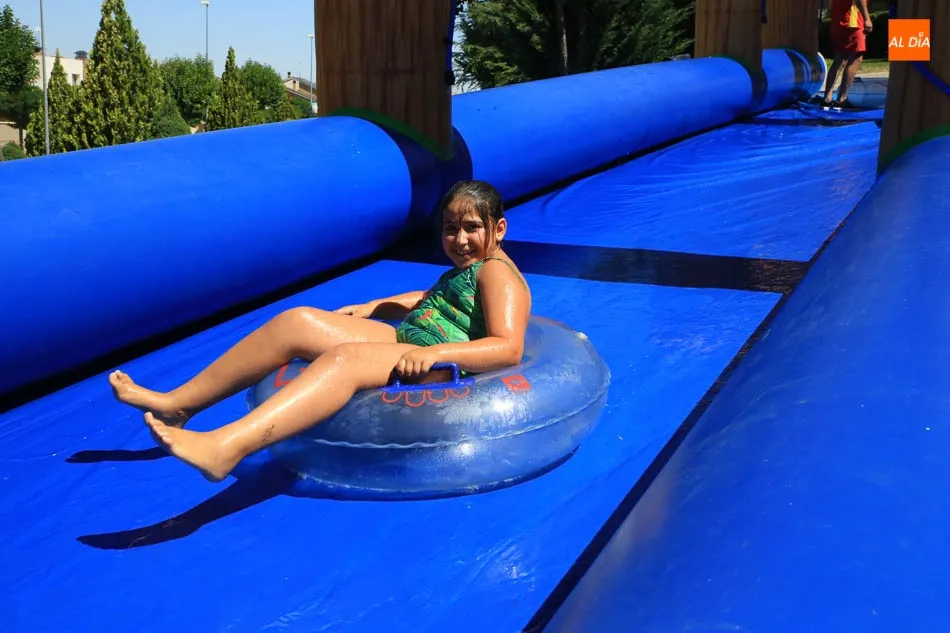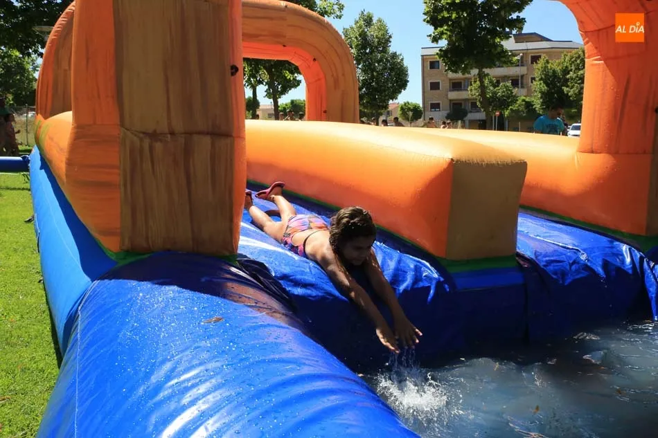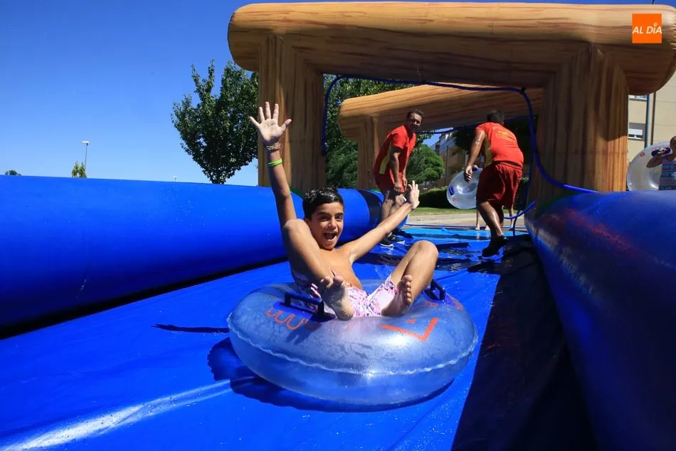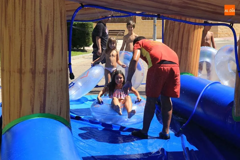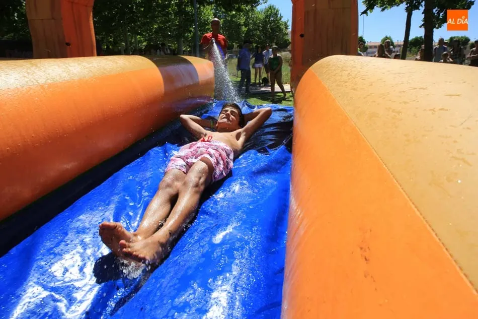 Las fiestas de San Roque, en Carbajosa de la Sagrada, siguen garantizando escenas divertidas, sobre todo para los más pequeños. Así, esta mañana, tenía lugar la Fiesta del Agua en el Prado de La Vega. Un atractivo programa acuático que incluía hinchables, tobogán y una gran rampa de 50 metros de largo, por la que desfilaron todos los participantes.