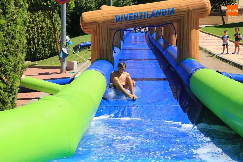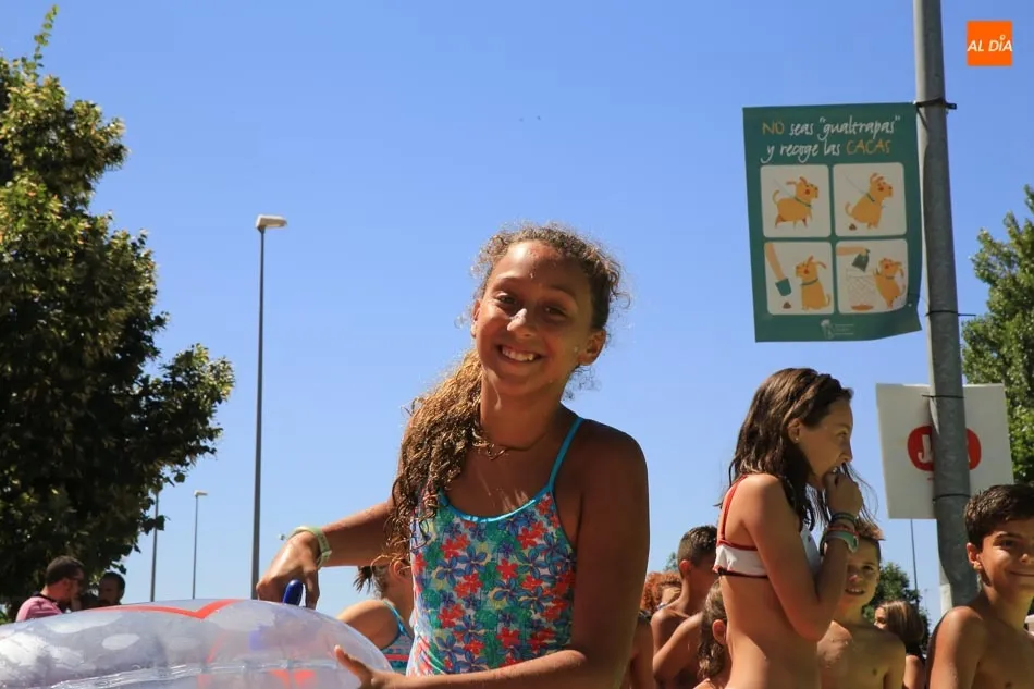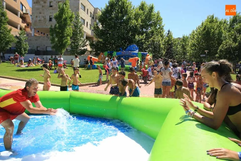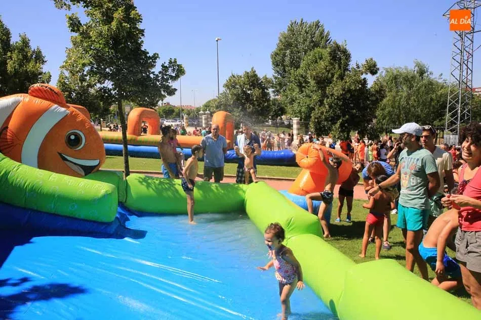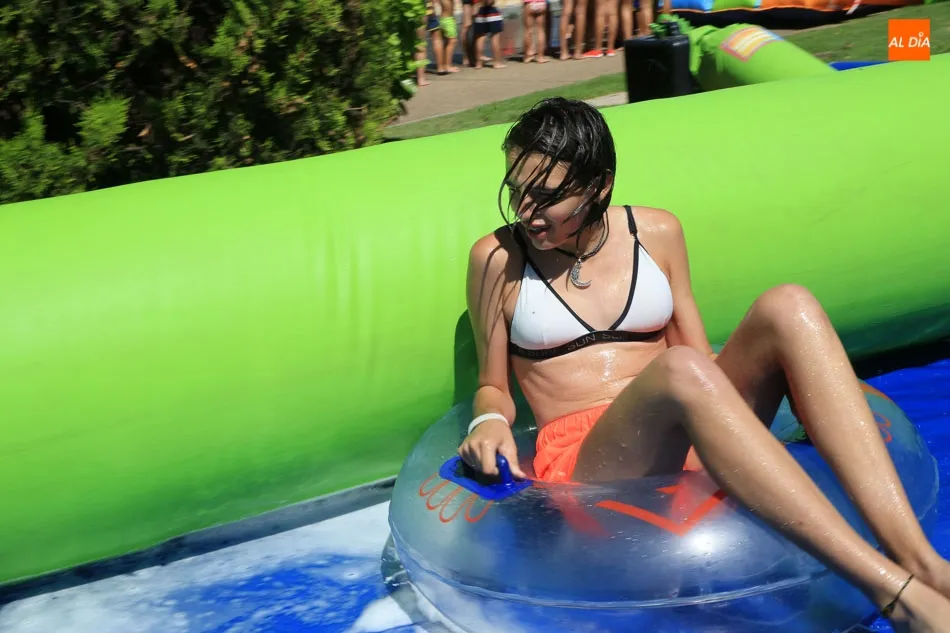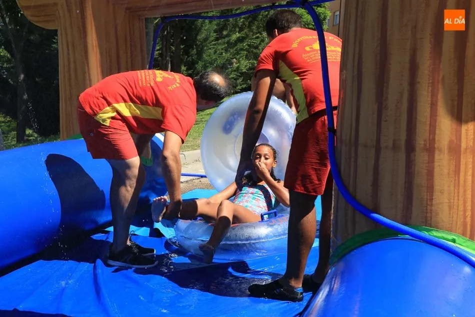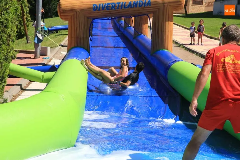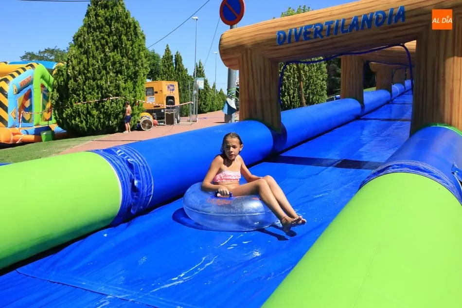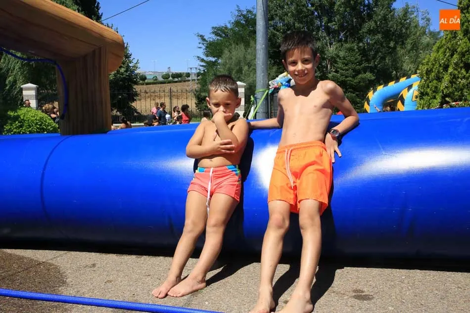 Las fiestas de San Roque, en Carbajosa de la Sagrada, siguen garantizando escenas divertidas, sobre todo para los más pequeños. Así, esta mañana, tenía lugar la Fiesta del Agua en el Prado de La Vega. Un atractivo programa acuático que incluía hinchables, tobogán y una gran rampa de 50 metros de largo, por la que desfilaron todos los participantes.