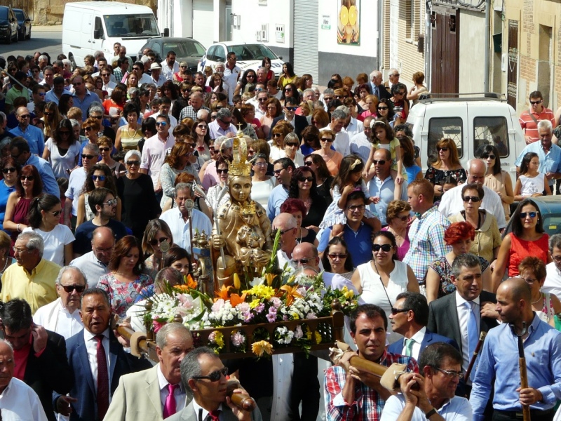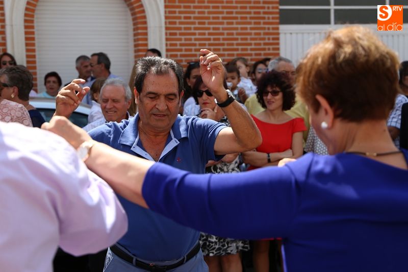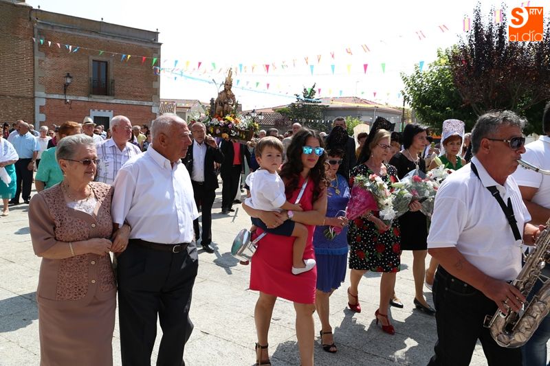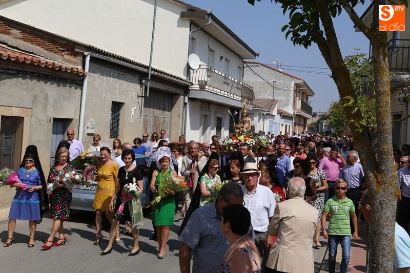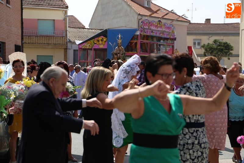 Cerca de las 13 horas, finalizada la eucaristía en la que cantó el Coro Albahaca, comenzaban a salir de la iglesia parroquial de Villoria los vecinos para sumarse a la procesión, acompañando a la imagen de la Virgen de la Vega en el día grande de las fiestas. El cortejo dejó atrás la Plaza Mayor, con la torre del templo de fondo, para recorrer las calles de la localidad, realizando varias paradas para bailar las jotas. Miembros de la Corporación municipal, encabezada por Julián Barrera, fueron los encargados de portar a hombros a la patrona a lo largo de la procesión.