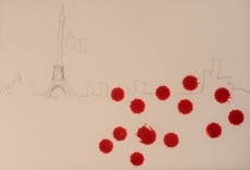 Y sin embargo, preparé mis tintas y mi papel, y durante 40 minutos contemplé lo blanco y escuché el silencio de la celulosa sin ánimo alguno. Hasta que tomé un frasco y dejé caer unas gotas. El azar, lo juro, quiso que fueran 13 las gotas rojas que se estamparon..., y luego giré el papel para que formaran una alameda que no hubiéramos querido conocer. Y la ilsutración siguió. No sé lo que fue, pero algo me dijo que mi silencio les daba la victoria, y que al menos las víctimas se merecían nuestro canto triste, desgarrado, pero esperanzador como la voz de la Piaf, y de..., ya sabéis...
