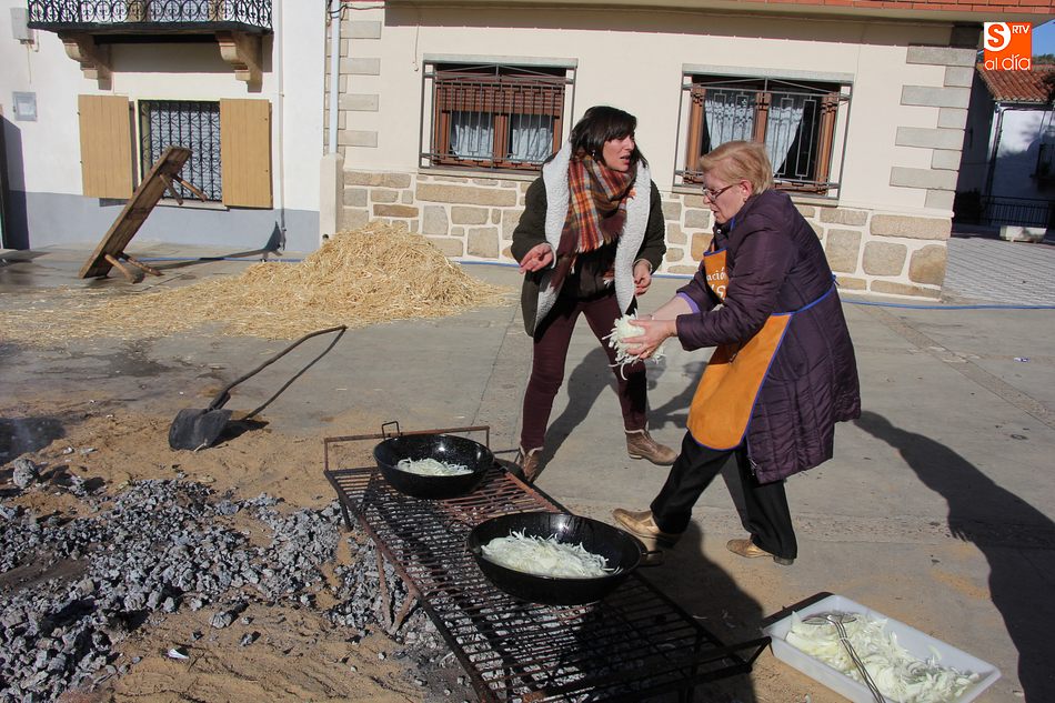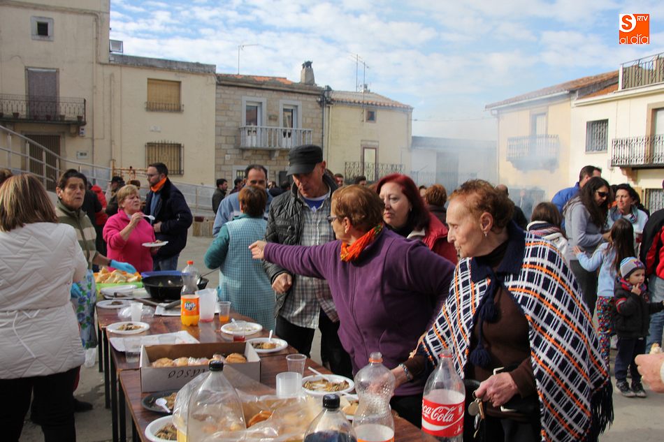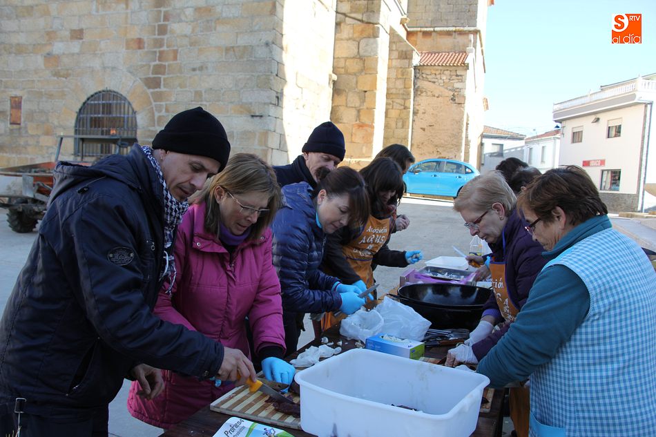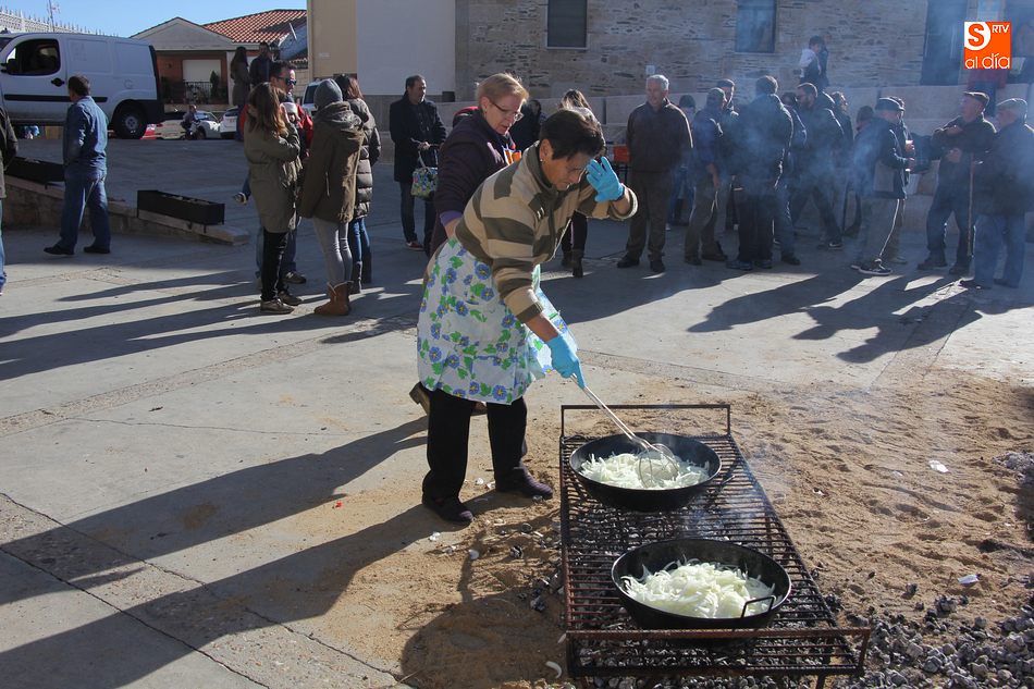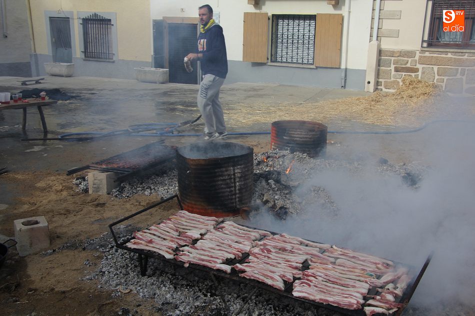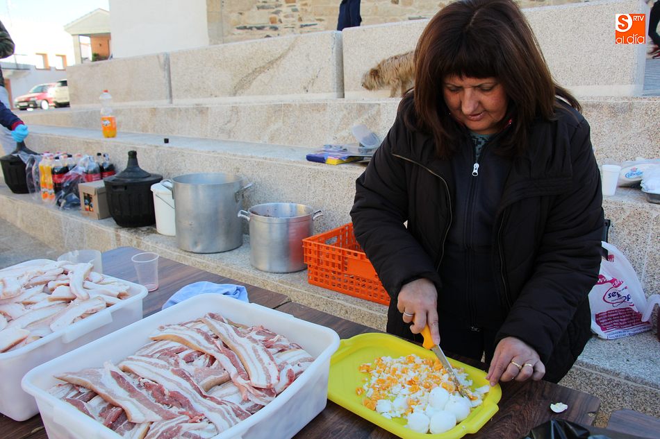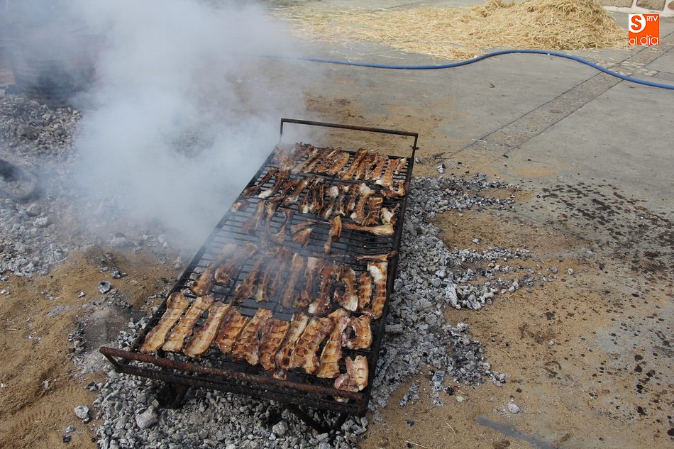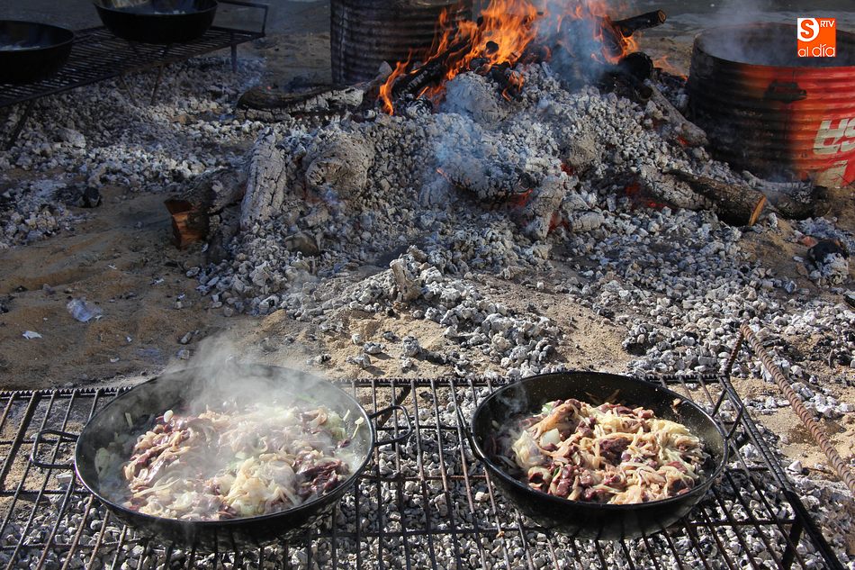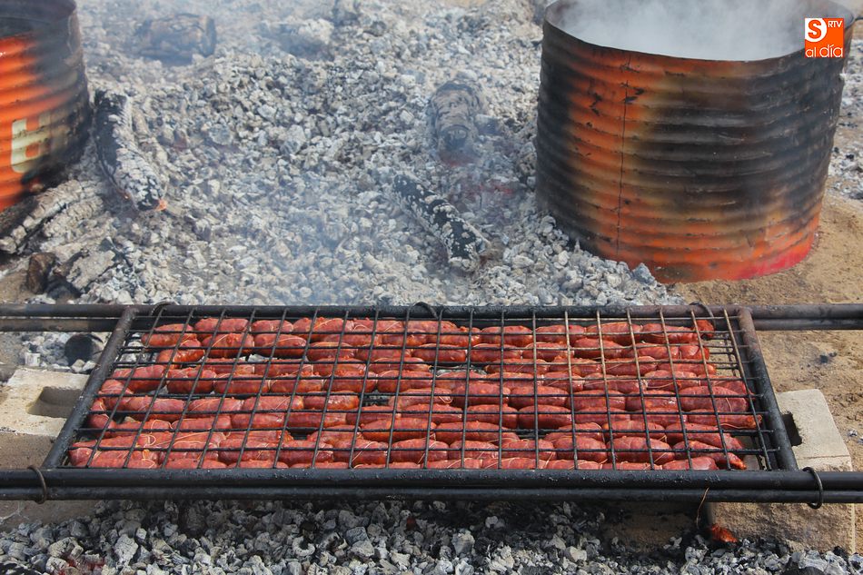 Mientras, las mujeres se afanaban en los preparativos picando ajos, cebolla o el pan para ofrecer a los asistentes un sabroso plato de hígado encebollado, que haría de almuerzo y al que se sumaban productos como el hornazo así como tocino, panceta y chorizo todo ello a la parrilla aprovechando la lumbre, y regado con vino para su degustación posterior.