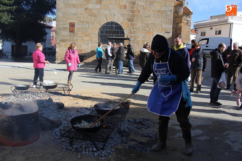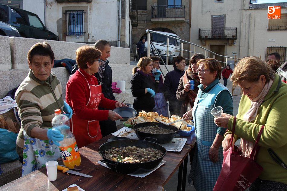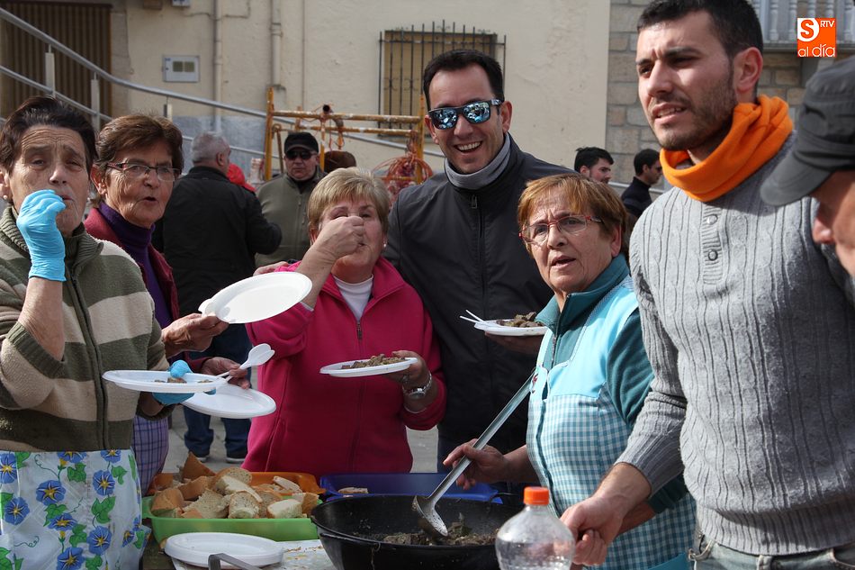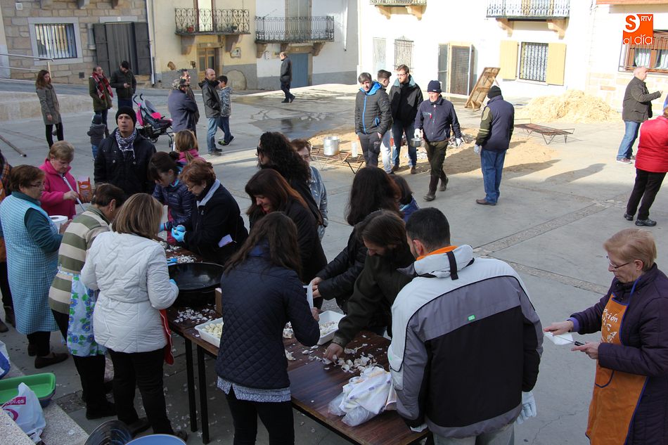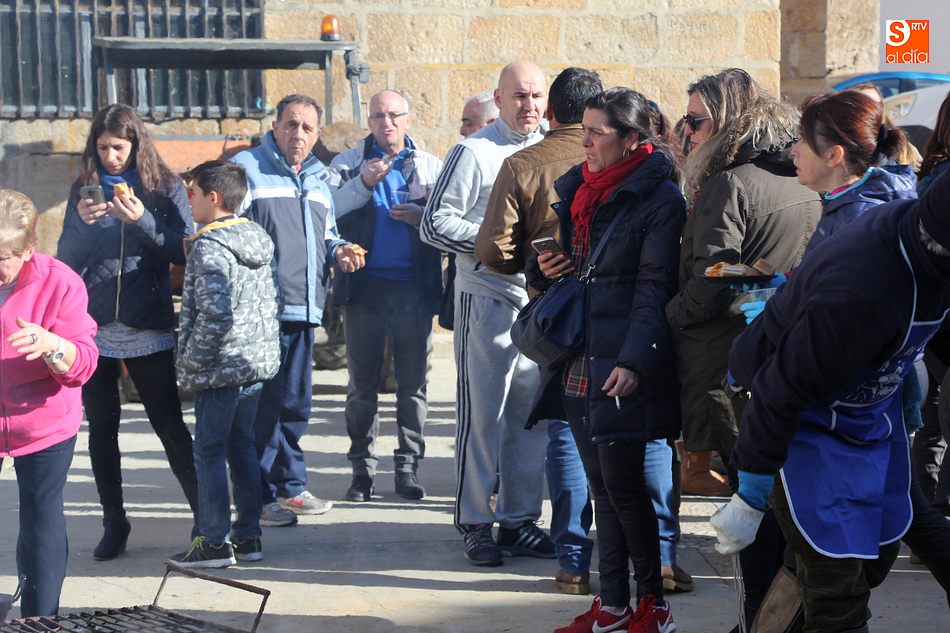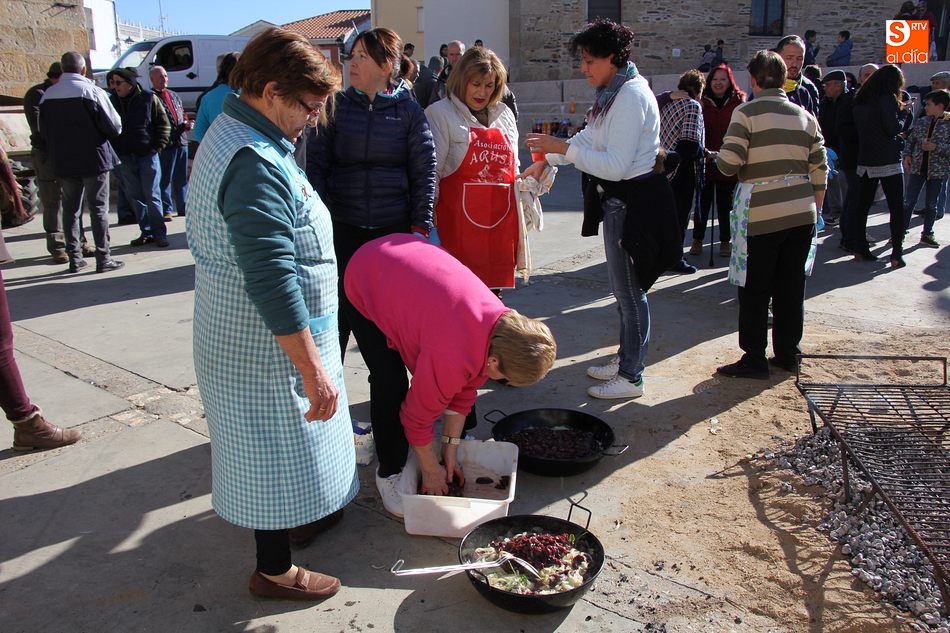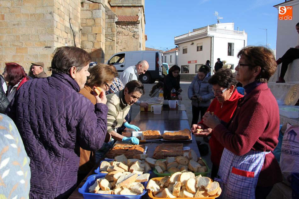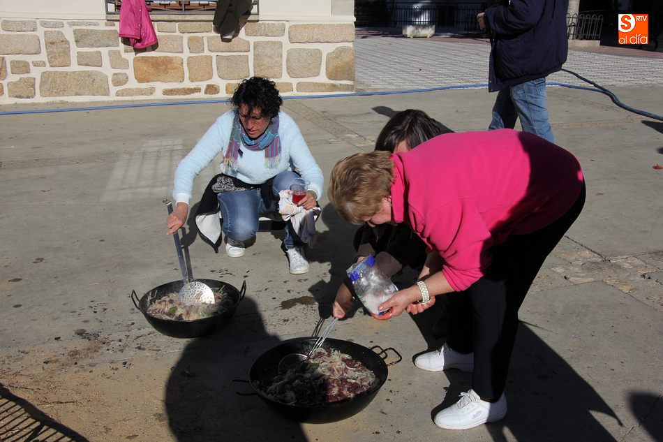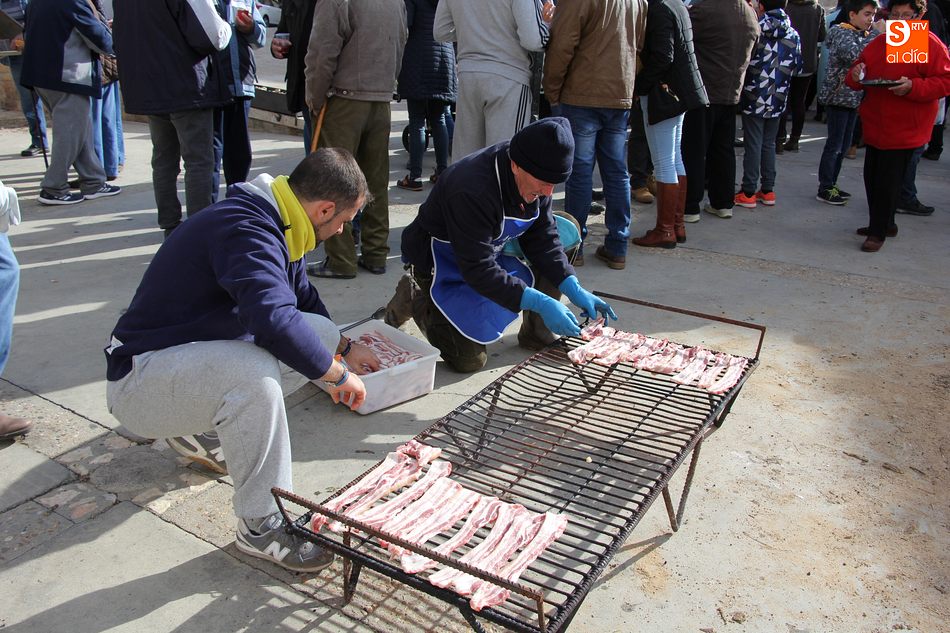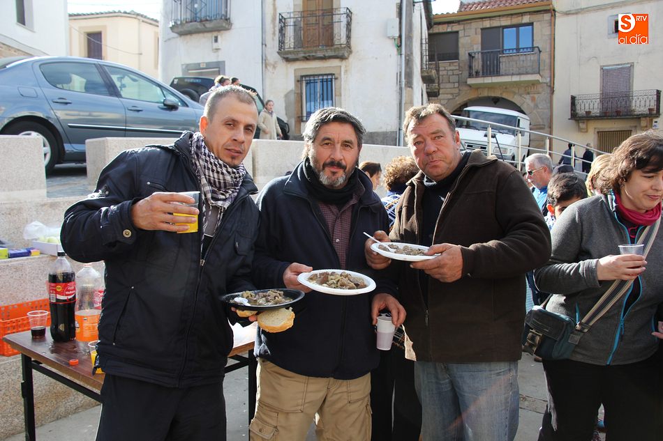 Mientras, las mujeres se afanaban en los preparativos picando ajos, cebolla o el pan para ofrecer a los asistentes un sabroso plato de hígado encebollado, que haría de almuerzo y al que se sumaban productos como el hornazo así como tocino, panceta y chorizo todo ello a la parrilla aprovechando la lumbre, y regado con vino para su degustación posterior.