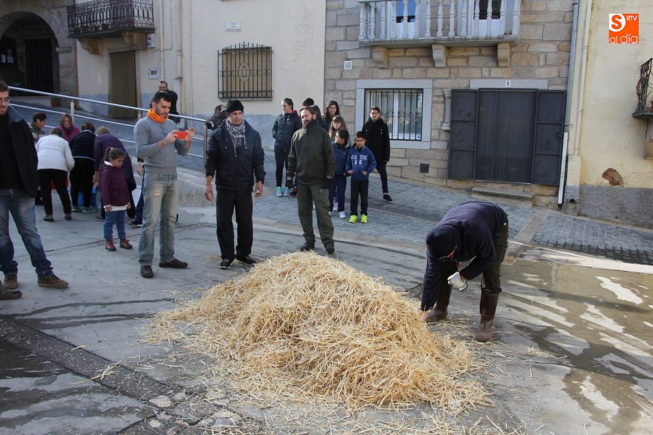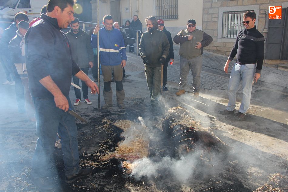 Pasado el mediodía hacia su entrada ya inerte la protagonista de la jornada, una marrana de unos 200 kilos, que una vez cubierta con la paja preparada se procedía al chamuscado, primero de un lado y dándole la vuelta, para posteriormente rasparla y lavarla.