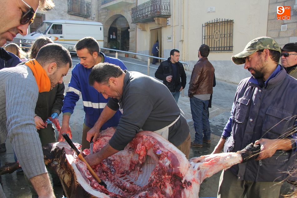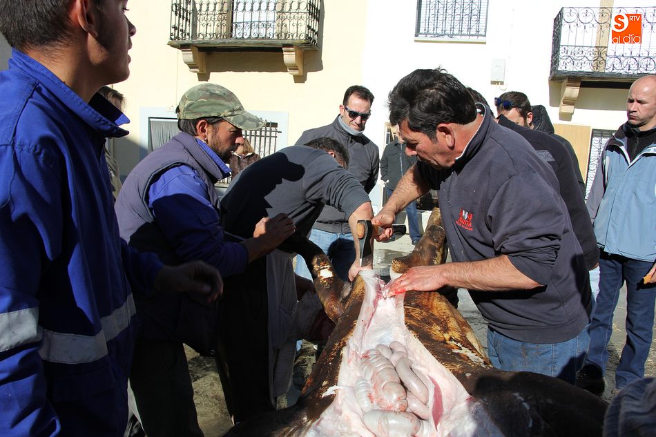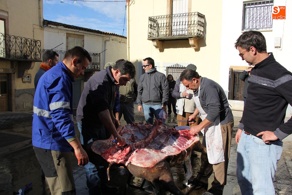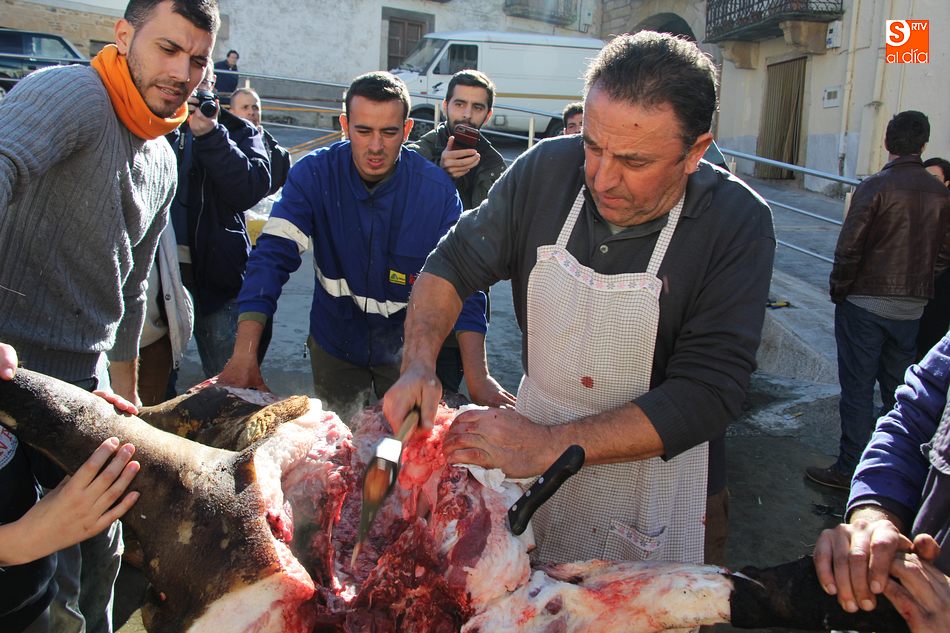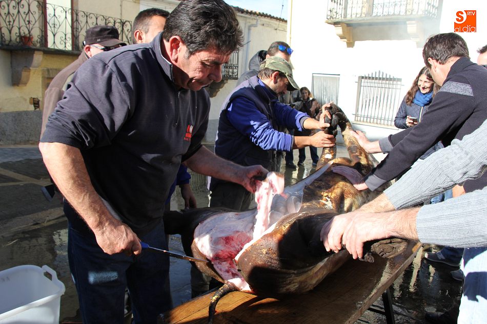 Así, llegaba el momento de subirla al tajo y empezar el despiece. Para esta tarea se contó con la maestría de Paco y de Maxi, carnicero y panadero de Saucelle, comenzando el despiece con la separación del manto, paso imprescindible que facilita el destripado, para pasar más adelante a la extracción de las costillas y espinazo, y así dejar al descubierto los lomos, y finalizar con el corte de jamones y paletas, todo ello ante la mirada de pequeños que miraban curiosos, y los mayores que miraban con añoranza de otros tiempos.