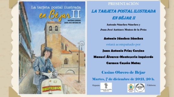 Este martes 7 de diciembre el Centro de Estudios Bejaranos organiza la presentación del libro "La Tarjeta Postal Ilustrada en Béjar II" de Juan José Antúnez Muñoz de la Peña y Antonio Sánchez Sánchez. Será en el Casino Obrero de Béjar a las 20 horas. En este acto el autor Antonio Sánchez estará acompañado por Manuel Álvarez-Monteserín Izquierdo, Carmen Cascón Matas y Juan Antonio Frías Corsino, todos ellos miembros del Centro de Estudios Bejaranos.