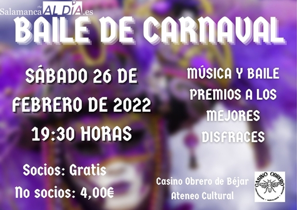 El Ateneo Cultural Casino Obrero de Béjar celebrará el próximo sábado día 26 de febrero de 2022 su tradicional baile de carnaval. Este evento tendrá lugar en el Salón Principal a partir de las 19:30 horas.