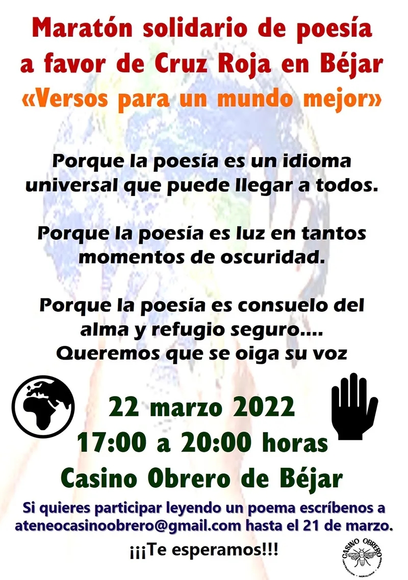 Aunque el Día Mundial de la Poesía se conmemora este lunes 21 de marzo, será el próximo martes día 22, cuando el Casino Obrero de la ciudad textil celebre un maratón de poesía solidario a favor de Cruz Roja en Béjar. La Sala de Exposiciones y Conferencias del Ateneo se convertirá en el epicentro poético desde las 17h.