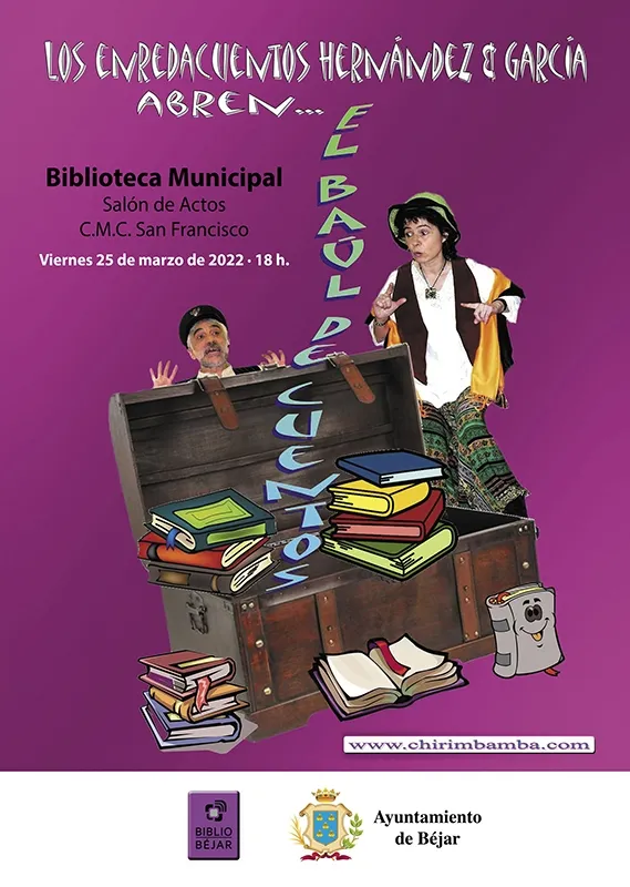 El próximo viernes 25 de marzo, a las 18h en el Salón de Actos del C.M.C. San Francisco., tendrá lugar una nueva sesión de cuentacuentos dentro del programa de animación a la lectura organizado por la Biblioteca Municipal de Béjar. En esta ocasión "Chirimbamba"", con sus personajes Hernández y García, nos contarán "El baúl de cuentos".