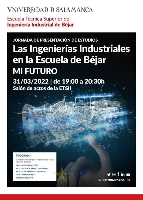 La Escuela Técnica Superior de Ingeniería Industrial (ETSII) de Béjar acogerá una jornada de presentación de estudios bajo la denominación ‘Las Ingenierías Industriales en la Escuela de Béjar: Mi futuro’. Tendrá lugar el 31 de marzo, de 19:00 a 20:30 horas, en el salón de actos del centro universitario bejarano.