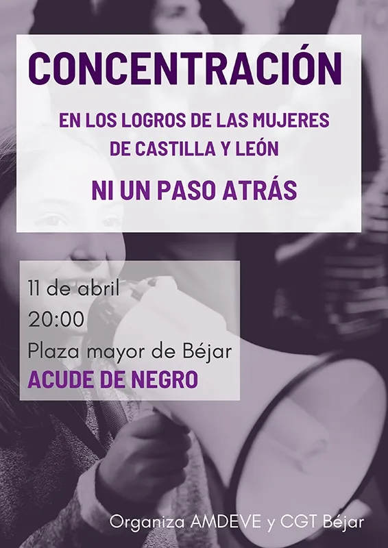 Con motivo de esta sesión de investidura del presidente de Castilla y León, AMDEVE y CGT de Béjar convocan “a la población y a los colectivos Bejaranos” a realizar una concentración en la Plaza Mayor este lunes 11 de abril a las 8 de la tarde para mostrar “nuestro rechazo” al nuevo ejecutivo. Ambos colectivos entienden que “se han negociado diferentes cargos políticos a cambio de aprobar legislación que entendemos retrocede en los derechos que hemos adquirido las mujeres después de muchos años”. Por ese motivo se convoca este acto para “mostrar nuestro rechazo a este retroceso y la exigencia de que se siga trabajando en pro de una sociedad más igualitaria”.