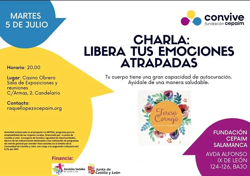 Este martes 5 de julio, a las ocho de la tarde, tendrá lugar en la sala de exposiciones y reuniones del Casino Obrero de Candelario una charla impartida por Teresa Cornejo, naturópata y geobióloga. En ella explicará lo que son las emociones atrapadas y mostrará a aquellos que acudan a cómo liberarse de ellas de una manera saludable.
