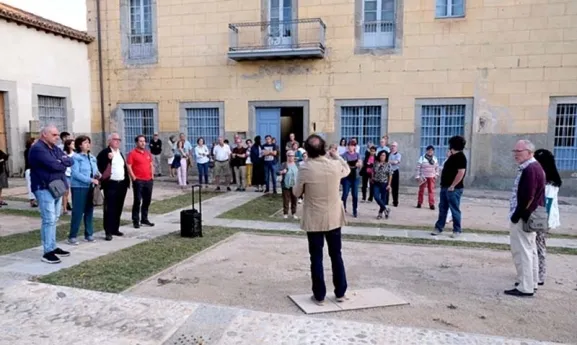 Tras esta breve exposición con diapositivas, los asistentes pudieron disfrutar de una visita guiada a la plaza norte, donde el conferenciante mostró la disposición de los hallazgos, que ahora yacen enterrados bajo la capa de arena apisonada a la espera de que surjan técnicas que permitan conservar en todo su esplendor el pavimento enchinado. No se dejó de lado la relevancia botánica de los elementos que aún perviven en su lugar original, como un boj de gran altura.