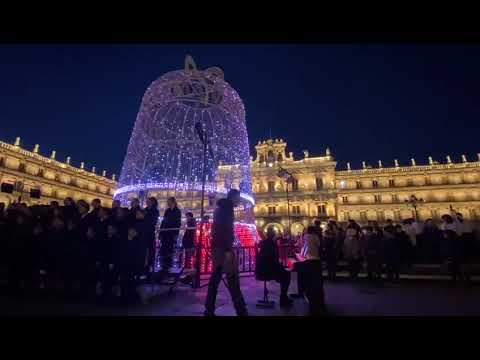 Tras el encendido y el espectáculo de imágenes de la campana, han comenzado las actuaciones de los coros . El primero en actuar será la Coral Polifónica y el Coro Juvenil Ciudad de Salamanca que interpretarán los villancicos Vamos pastorcitos de Bruce Trinkley y ¡Cantar! de Jay Althouse. A continuación está prevista la actuación del Coro Infantil de la Escuela Municipal de Música y Danza de Salamanca que interpretarán Canción de cuna de Gabriel Olaizola y ¡Ale Pun! Candombe. La tercera agrupación en actuar será el Coro de Niños Ciudad de Salamanca que interpretará Christmas lullaby de John Rutter y Joticas al niño de G. Cunchillas. El acto finalizará con la actuación conjunta de todos los coros interpretando el villancico popular Cabalgata real de Rafa Garrigós. En este enlace se puede ver la actuación: https://youtu.be/zqNMBCVWBKo