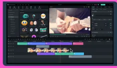 La característica especial que tiene esta herramienta es que con ellas puedes editar videos en capas. Si lo que necesitas es hacer vídeos de doble capa, es decir, colocar unos arriba de otros, esta es la herramienta ideal para ti. Además, puedes agregar grabaciones de voz (voz en off), texto, stickers, música, efectos y filtros.
