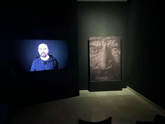 La Sala inicia su itinerario con la impresionante obra “Jesús” del artista muralista Caín Ferreras. Fruto de un encargo de la revista “Pasión en Salamanca”, el autor, conocido por sus impresionantes obras en la ciudad y en nuestros pueblos, inseparable del proyecto artístico urbano de Santa Marta de Tormes, fue una decisión valiente y aparentemente arriesgada, según Francisco Javier Blázquez, director de la Tertulia Cofrade Pasión, quien afirma, en el vídeo que explica la obra, la necesidad de que arte sea valiente y sorprenda al espectador.