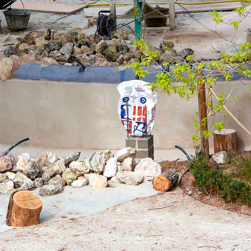 Restaurar no es recrecer ni sustituir, no es inventarse obras de fábrica donde no las hubo: ¿por qué extraño motivo están recreciendo en más de un palmo los bordes de la ría?, ¿por qué han acumulado pedruscos de caliza blanca pucelana donde tendrían que florecer las hortensias? (foto 4) Ningún otro componente acuático de El Bosque ha sufrido semejante alteración, y menos aún en piedra alóctona, así que deberíamos estar atentos por si la secta extiende sus zarpas sobre los pretiles del estanque o la pila de la Fuente de la Sábana, la de la plazuela o rotonda, la de la Fuente de los Ocho Caños, la circular de taza, la oval o la del Escudo. Recuerden aquello del tonto y la linde: ¿veremos nuevos recrecidos en estos receptáculos o tal arbitrariedad se reserva para la maltratada ría del Jardín Romántico? Señores y señoras de la Junta: llévense sus torpes pedruscos al Pisuerga.