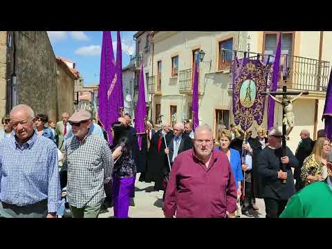 Finalizada la misa, cofrades y mayordomos salían de la iglesia de Nuestra Señora de los Álamos en fundados en sus capas negras y luciendo pendones y estandartes. A las puertas del templo el palio esperaba al Cordero bajo el himno de España entonado por la charanga Manliao, y tras el Nazareno, las mujeres con sus coloridas mantillas y tocadas con velos de terciopelo, para cerrar con las autoridades municipales y su alcalde Francisco de la Cruz al frente.