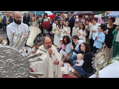 Las mayordomas y hermanas, María del Carmen y Ascensión Sevillano Sánchez, acompañadas de sus diputados y resto de miembros de la Cofradía Sacramental ‘Villa de Vitigudino’, presidieron este Jueves de Corpus la procesión del Santísimo por las Calles de Vitigudino, un acto que estuvo encabezado por los niños y niñas que han tomado la Primera Comunión y que discurrió bajo los sones de la gaita y el tamboril de Jorge Sousa, aunque la verdadera protagonista de la jornada fue la lluvia.