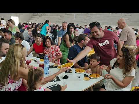 En esta ocasión el menú estaba formado por una gran paella para 500 personas, plato acompañado de pan, limonada, agua y helado de postre y del que los asistentes daban cuenta en el pabellón del frontón municipal o en sus propios domicilios.