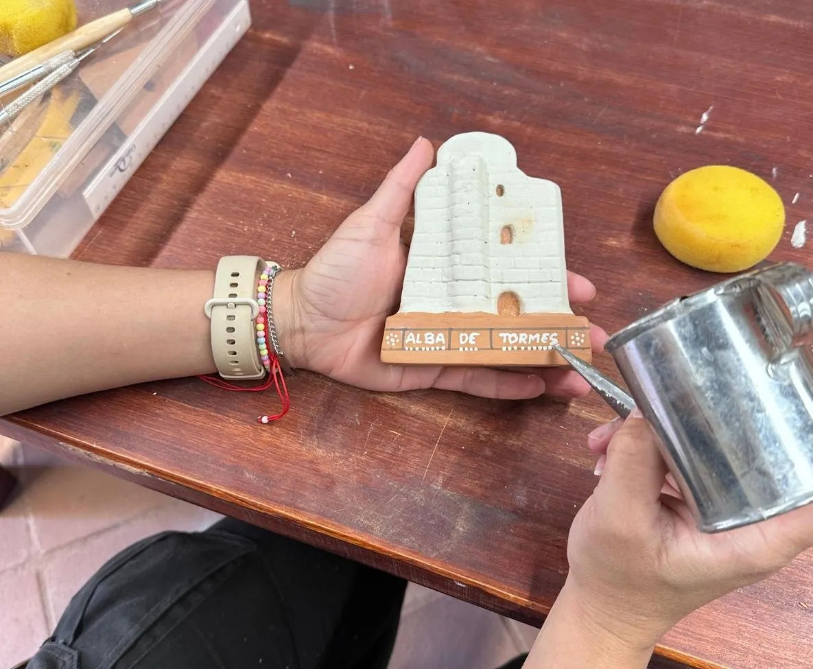El alumnado también ha estado preparando un molde matriz para la elaboración de objetos cerámicos representando la torre del homenaje del Castillo de los Duques de Alba, decorados con juaguete blanco (barro blanco de la zona) y óxidos metálicos y esmaltados con barniz de base plúmbica.
