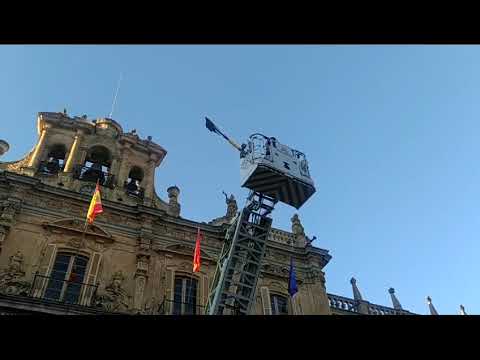 'La Mariseca' ya ondea en lo más alto de la Plaza Mayor de Salamanca. Los bomberos municipales se han encargado, como es tradicional, de colocar este símbolo que anuncia la proximidad de las ferias y fiestas de la capital salmantina.