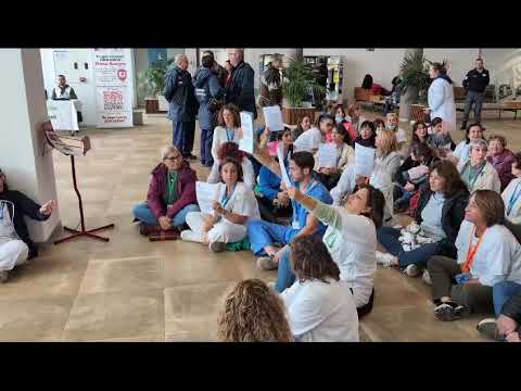 Esta mañana, un grupo de profesionales del Hospital de Salamanca han protagonizado una sentada en el vestíbulo principal de este centro, con el fin de mostrar su malestar por su situación laboral.