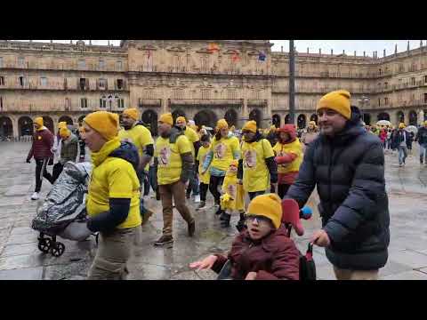 Pese a la lluvia y el viento, numerosas personas han participado este domingo en Salamanca en la VII Marea Amarilla con la que Aerscyl comemora el Día Mundial y da visibilidad a las enfermedades raras.