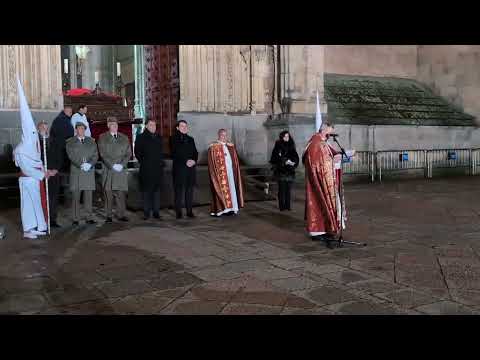 El Jueves Santo ha comenzado con la salida de la Real Cofradía Penitencial del Cristo Yacente de la Misericordia y de la Agonía Redentora de la Puerta de Ramos de la Catedral de Salamanca. Antes de la salida de los pasos del templo ha tenido lugar la tradicional Oranción del Silencio, en la que han participado el presidente de la Junta de Castilla y León, Alfonso Fernández Mañueco, y el alcalde de Salamanca, Carlos García Carbayo.