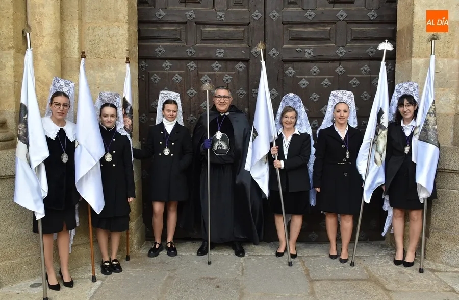 Tras su ausencia el año pasado, la Cofradía de Nuestra Señora de La Soledad ha vuelto a participar en este 2024 en la procesión de cierre de la Semana Santa de Ciudad Rodrigo, asistiendo su presidente, Tomás Domínguez, con su túnica, junto a seis cofrades con mantilla blanca que portaron otras tantas banderas de la Cofradía, como se puede ver en la imagen.