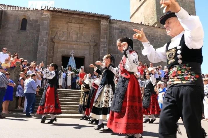 Tras la misa concelebrada y oficiada por el sacerdote Bernabé Marcos Marcos, con presencia de autoridades locales, entre los que se encontraba el alcalde Javier Muñiz, acompañado del teniente de alcalde Chago Vicente con la concejala Isabel Cañizal, las campanas de la iglesia anunciaban la salida de la Virgen del Socorro a hombros de sus fieles y escoltada por sus mayordomas. Entre tanto, los sones de la gaita y el tamboril de Jorge Sousa comenzaban a escucharse para recibir en la calle a Nuestra Señora, donde la aguardaban los integrantes del grupo de folclore Organza para ofrecerle una charrada.