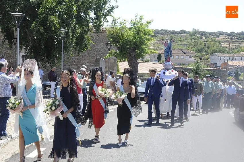 Acompañaban a la imagen de la Virgen las madrinas del 2024, portando la figura sus jóvenes acompañantes seguidos por el séquito encabezado por la alcaldesa de la localidad Laura Vicente y miembros de la corporación, el Capitán de la Guardia Civil Pablo Javier Gatell, mandos de la Policía Nacional y el diputado provincial Gerardo Marcos, en representación de la comarca mirobrigense. Tras las autoridades, completaban la comitiva numerosos fieles y devotos a la Virgen de la Asunción, vistiendo sus mejores galas para tal ocasión.