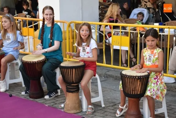 Como explicamos en la jornada del miércoles, uno de los objetivos que tienen l@s niñ@s en este Divierteatro 2024 es ir consiguiendo en sus pasaportes los sellos acreditativos de haber pasado por todos y cada uno de los enclaves en los que está dividido el espacio, cuyo punto más sonoro es el taller de danza y percusión de África que corre a cargo de la compañía Sökolé ritmos y experiencias. En este lugar, los chavales están pudiendo especialmente tocar el yembé, ofreciéndose también instrumentos ‘de mano’.