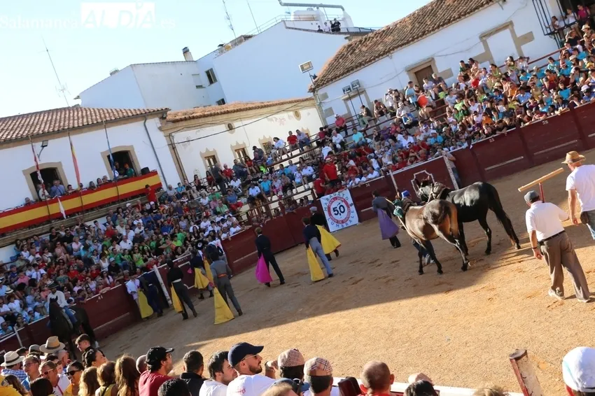 Tarde de fiesta en Lumbrales en la segunda de abono, especialmente para las peñas situadas bajo el tendido de sol que a ritmo de reguetón no dejaron escuchar al público ni los cambios de tercio. Festival con novillos de José Cruz, manejables, para el matador Morenito de Aranda y el novillero con caballos Pérez Pinto, que lograron una oreja cada uno en el primero de su lote.