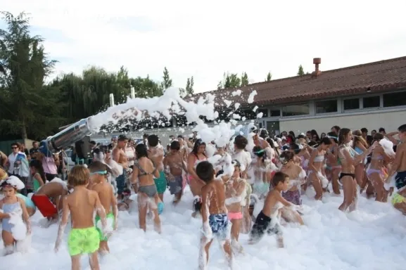 Al finalizar el tiempo de los hinchables dio comienzo la fiesta de la espuma justo en la zona asfaltada a la entrada de las piscinas municipales.