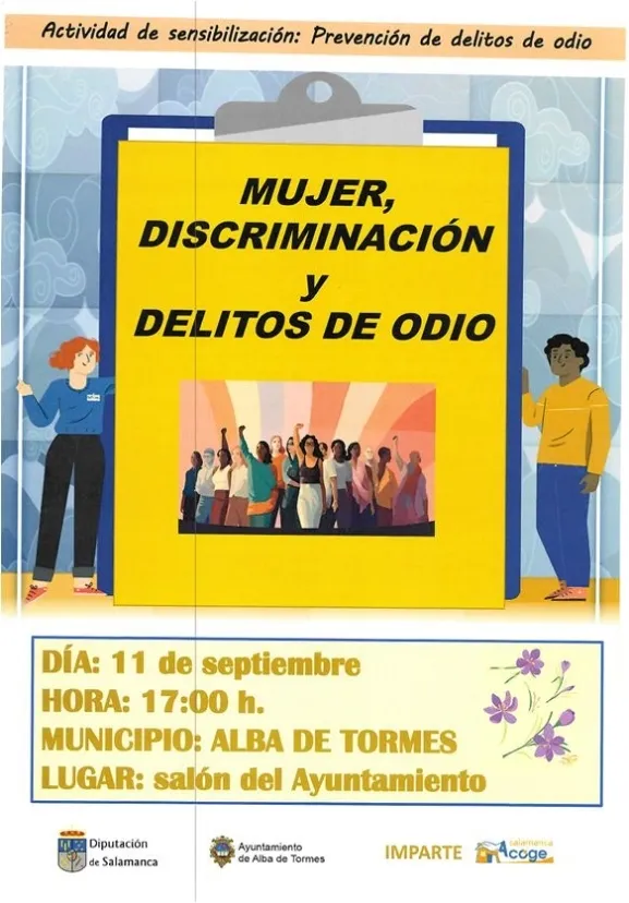El próximo 11 de septiembre, a las 17:00 horas, el Salón de Plenos del Ayuntamiento de Alba de Tormes será el escenario de la jornada "Mujer, Discriminación y Delitos de Odio", una actividad de sensibilización organizada en colaboración con el Centro de Acción Social (CEAS), la Diputación de Salamanca y el Ayuntamiento de Alba de Tormes.