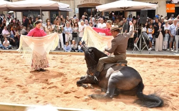 Junto a la doble exhibición de la pista de competición, el otro gran componente de la mañana del sábado fue el espectáculo que hubo a última hora de la mañana en la pista de arena de la Plaza Mayor. Este espectáculo de fusión ecuestre, con caballistas y bailaoras, corrió a cargo de la Compañía Flamenco El Romero, congregando bastantes espectadores en un tramo de la jornada en la que principalmente lució el sol.