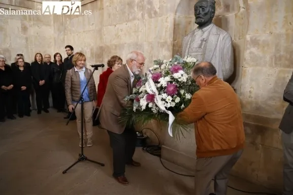 Este viernes tenía lugar en la Facultad de Filología de la Universidad de Salamanca una ofrenda floral junto al busto de Miguel de Unamuno, situado en las escaleras del emblemático Palacio de Anaya.