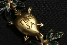 Finalmente, y volviendo sobre el collar, todo en él parece tener una razón de ser. Para empezar, no es casual el número de eslabones que lo componen, veintiuno, pues coincide con el número de monjas recomendado por santa Teresa de Jesús en sus fundaciones. Tampoco debe sorprender que la comunidad madrileña optara por una pieza de este tipo, se trata de un objeto íntimamente relacionado con la vivencia que ella misma relata en el capítulo XXXIII de su vida, donde narra el suceso acaecido el 15 de agosto de 1561, cuando oyendo misa en la iglesia del convento dominico de Santo Tomás en Ávila, la Virgen y San José le impusieron un collar de oro, una escena, por otra parte, ampliamente reproducida en la iconografía teresiana. Por último, y no descartamos que fuera esta la razón última del encargo, en el año 1726 el papa Benedicto XIII instituyó la festividad de la Transverberación de Santa Teresa de Jesús, desde luego el motivo de los eslabones, corazones transverberados, así parece sugerirlo.