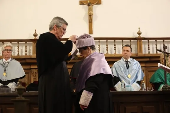 Para finalizar, Paz Quevedo concluyó que todas estas razones, “solamente esbozadas, que siempre han estado vinculadas a su permanente compromiso con los valores y fe cristiana de los que se enorgullece, y que son el pilar fundamental del ideario de nuestra Universidad, la hacen merecedora de este reconocimiento por el que se incorporará al claustro de personas insignes de la Universidad Pontificia de Salamanca”.
