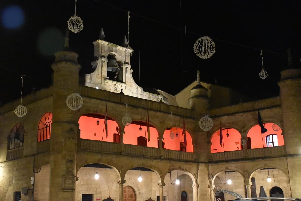 En el último fin de semana previo al encendido del alumbrado navideño, la Plaza Mayor de Ciudad Rodrigo tiene también un color diferente, al contar una vez más la balconada de la Casa Consistorial con una iluminación especial.