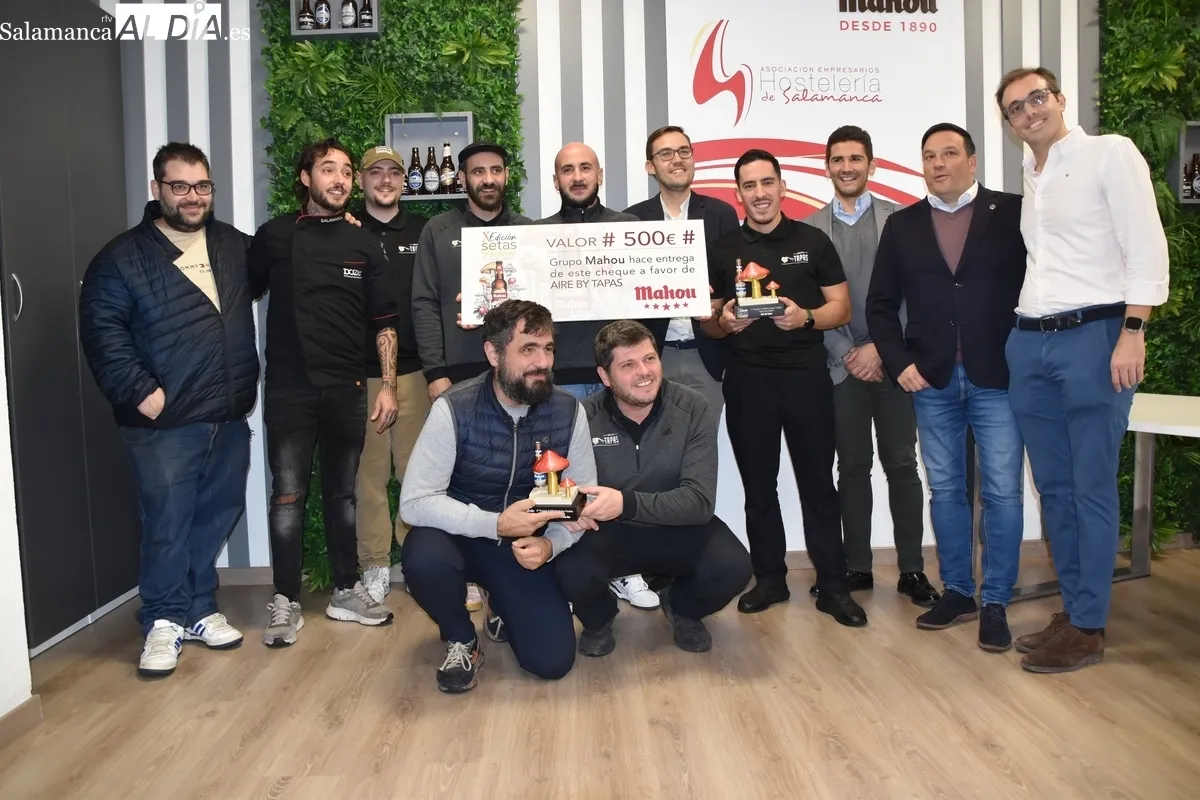 La décima edición del concurso Setas Fusión ya tiene ganador. El establecimiento Aire By Tapas ha elaborado el pincho 'Golf en Otoño', que ha cautivado al jurado de expertos y se ha proclamado como vencedor de este concurso. El concejal de Turismo del ayuntamiento de Salamanca, Ángel Fernández Silva, hizo entrega del trofeo. Además, Sammer Nimer, gestor comercial de Mahou, hizo entrega de un cheque por valor de 500 euros.