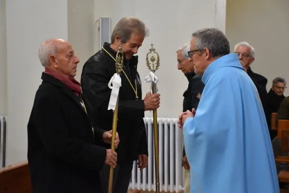 La secuencia de actos comenzó en la Iglesia de Santa Marina, con una eucaristía aplicada en memoria de los cofrades difuntos que fue presidida por el párroco, Prudencio Manchado, quién apuntó que “no debemos dejar que desfallezca” la Cofradía, en torno a la cual hubo dos momentos durante la celebración litúrgica: por un lado, se impusieron las medallas de cofrade a dos nuevos integrantes de la entidad; y por otro lado, se produjo el relevo en la Mayordomía de San Antón.