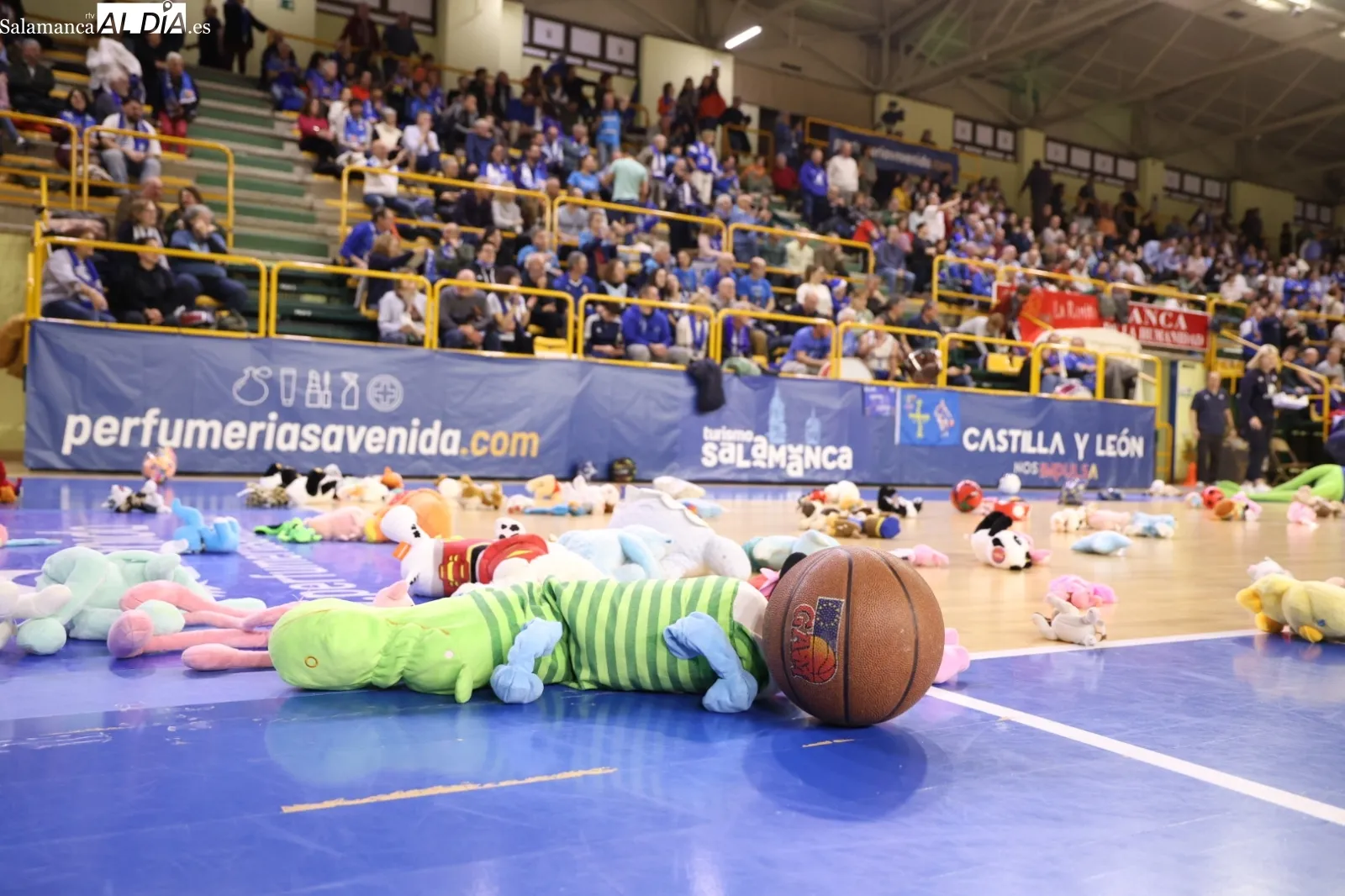 La Marea Azul del Perfumerías Avenida no ha fallado en Liga contra el Joventut con la lluvia de peluches. A pesar de la derrota en Euroliga con el Cukurova de hace unos días, la afición salmantina ha animado a las suyas en este partido tras la baja de Laura Cornelius.