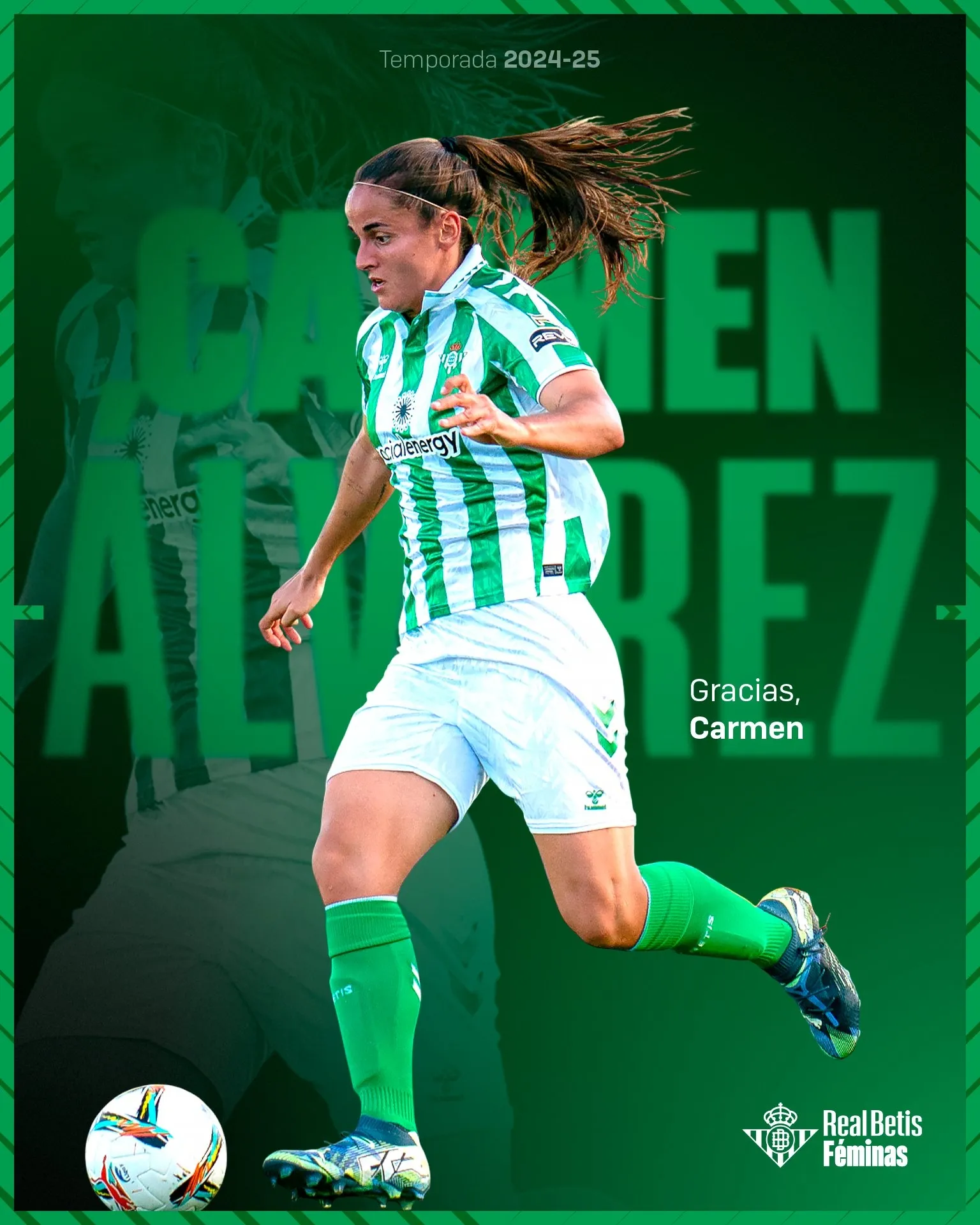 Carmen Álvarez recibió el alta médica en las primeras semanas de la actual temporada 2024/2025, teniendo sus primeros minutos sobre el césped a finales de octubre, pero apenas había intervenido hasta la fecha en 6 partidos del Real Betis, que le muestra su agradecimiento y le desea “lo mejor” en sus próximos retos deportivos.