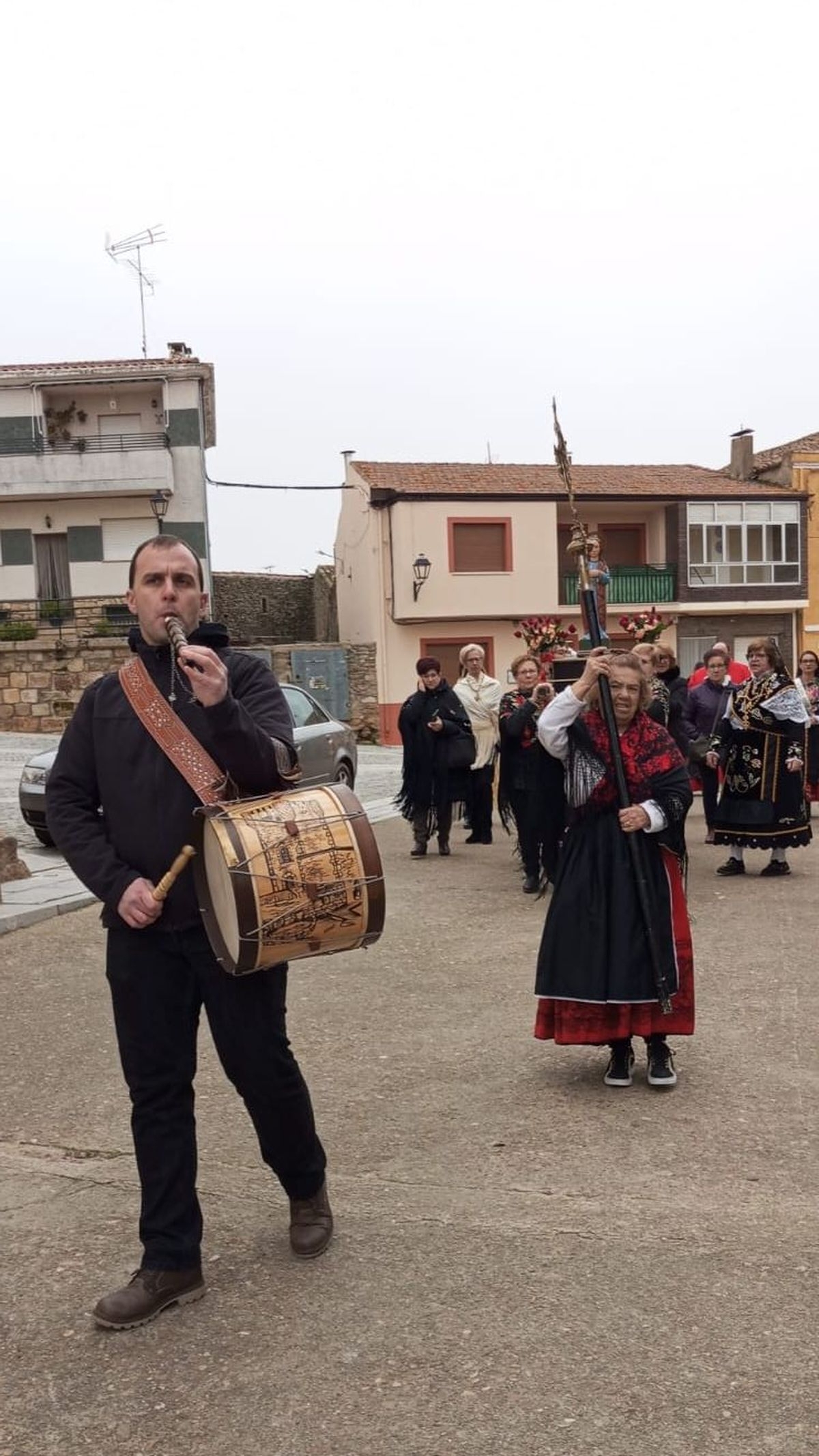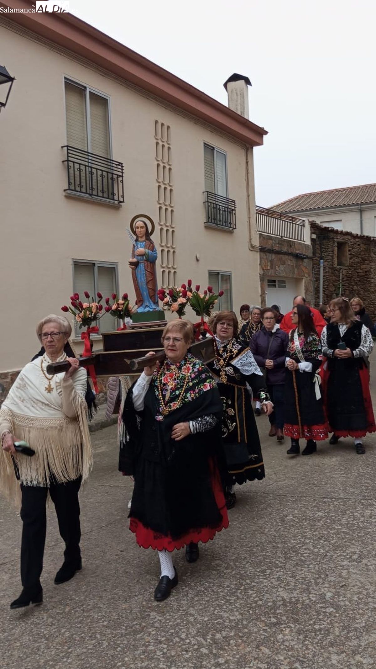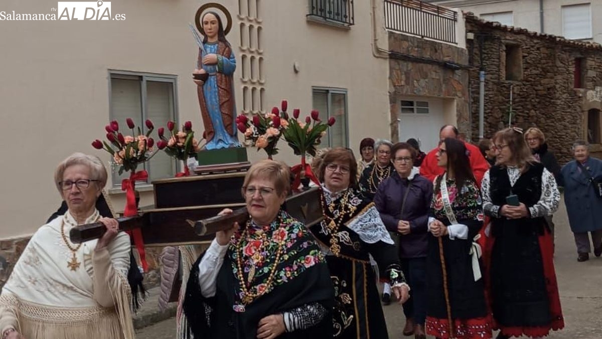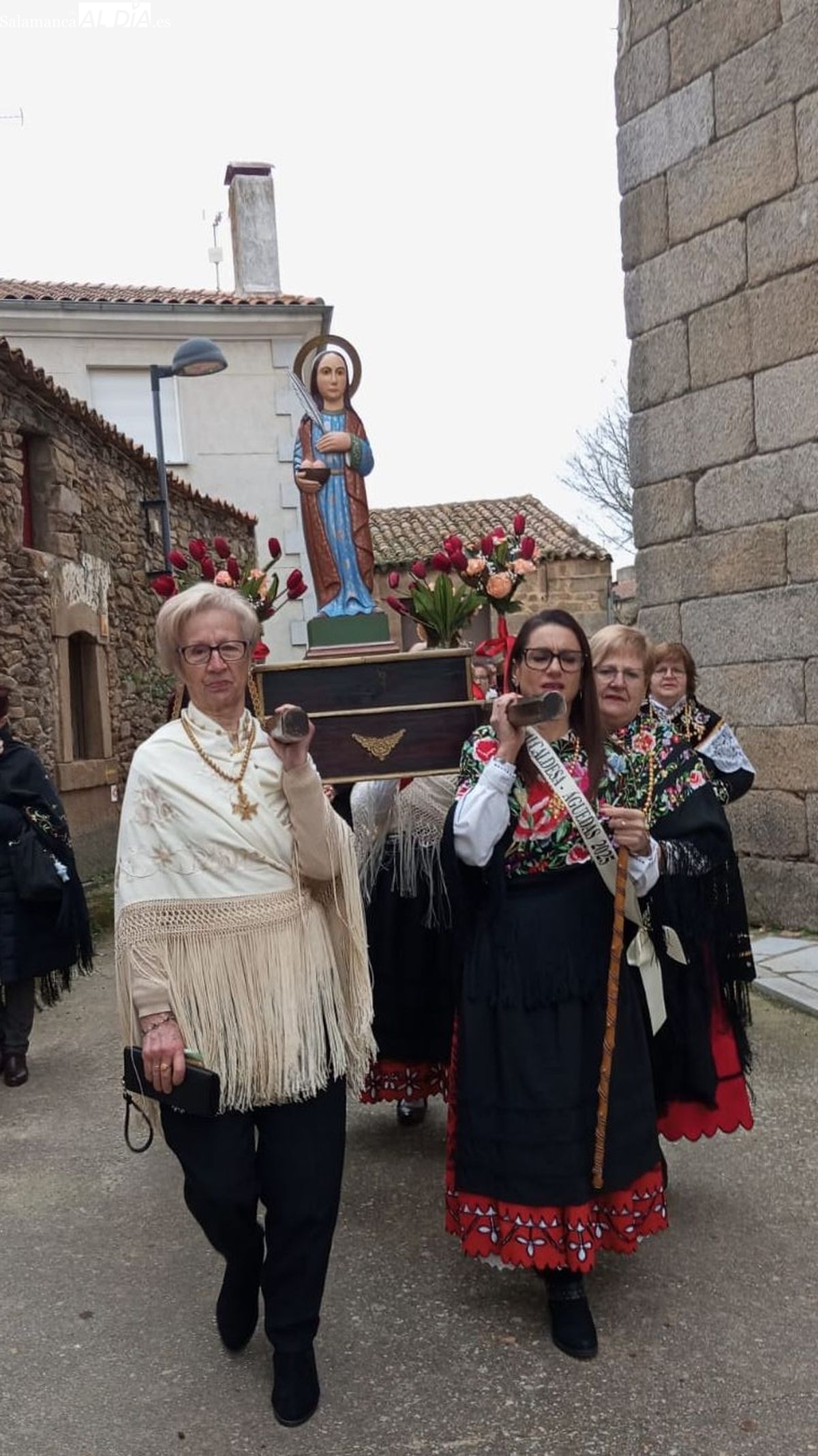 Después de este acto, llegó el momento de honrar a Santa Águeda con una misa en la iglesia parroquial, oficiada por el párroco, José Sánchez Arroyo, a la que seguiría una procesión con la imagen de la Santa, acompañada de la música de gaita y tamboril tocada por el tamborilero local Álvaro Simón. Al término de la celebración religiosa, en la Plaza del pueblo las Águedas ofrecieron un convite -dulces, flores y aguardiente- a los vecinos acompañantes, convite amenizado con bailes charros y cantos al son de la gaita y el tamboril.