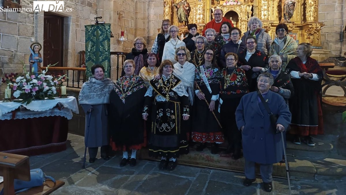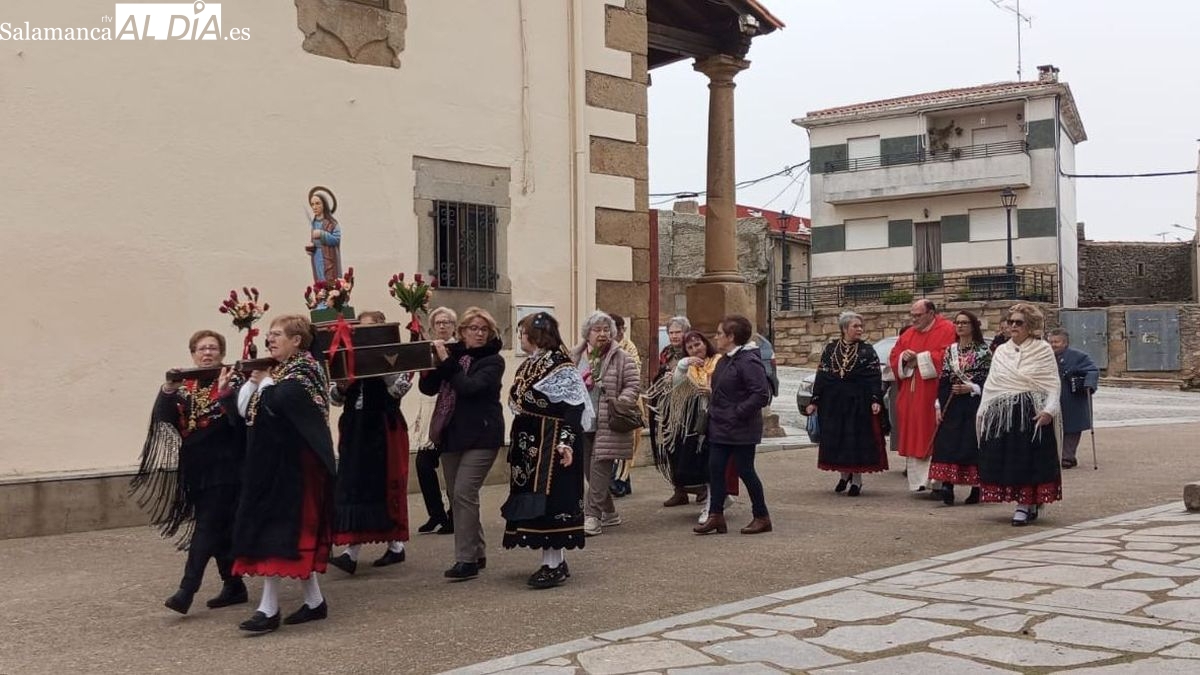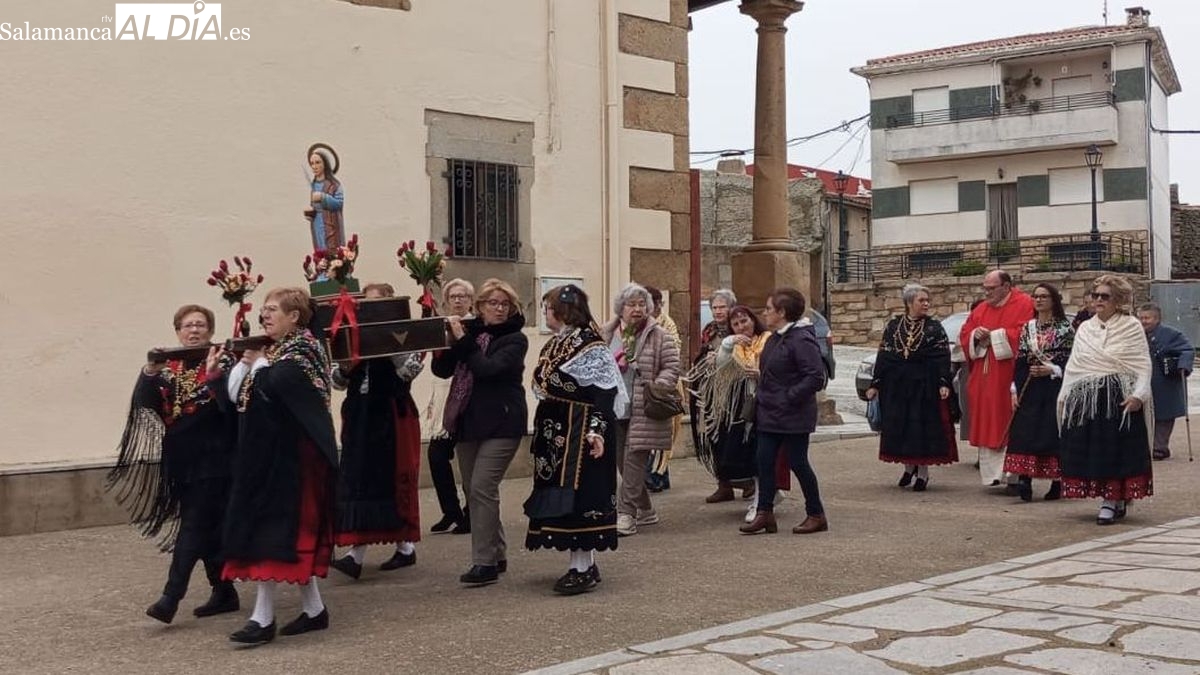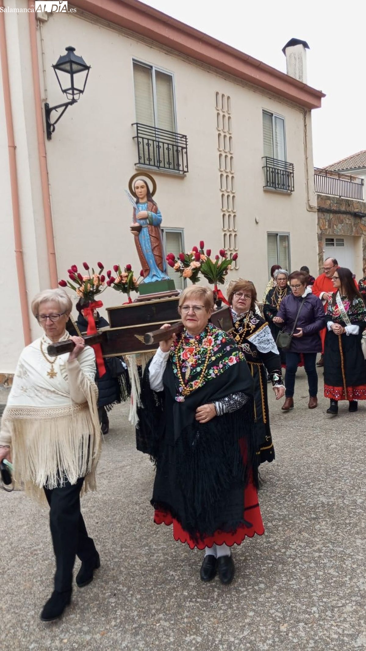Después de este acto, llegó el momento de honrar a Santa Águeda con una misa en la iglesia parroquial, oficiada por el párroco, José Sánchez Arroyo, a la que seguiría una procesión con la imagen de la Santa, acompañada de la música de gaita y tamboril tocada por el tamborilero local Álvaro Simón. Al término de la celebración religiosa, en la Plaza del pueblo las Águedas ofrecieron un convite -dulces, flores y aguardiente- a los vecinos acompañantes, convite amenizado con bailes charros y cantos al son de la gaita y el tamboril.