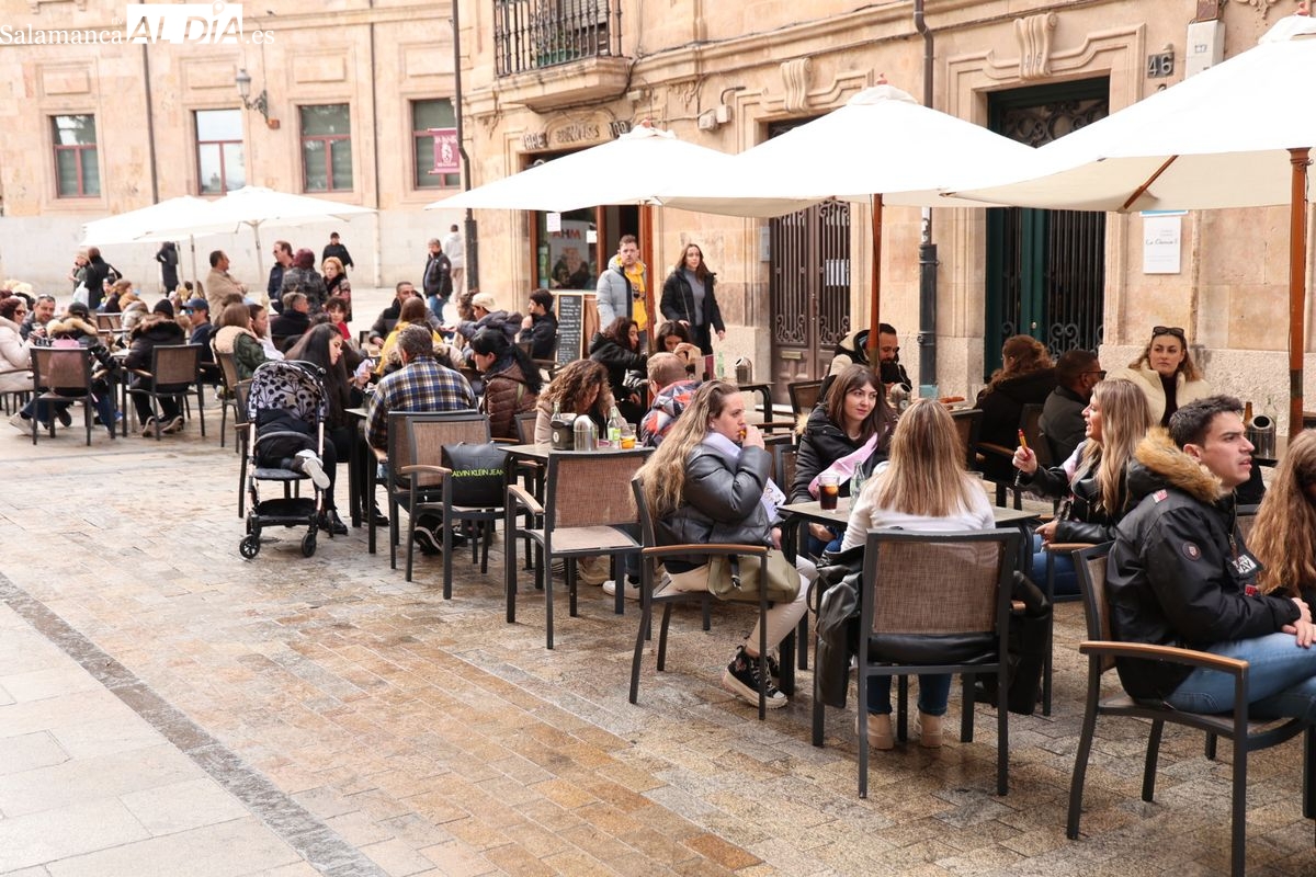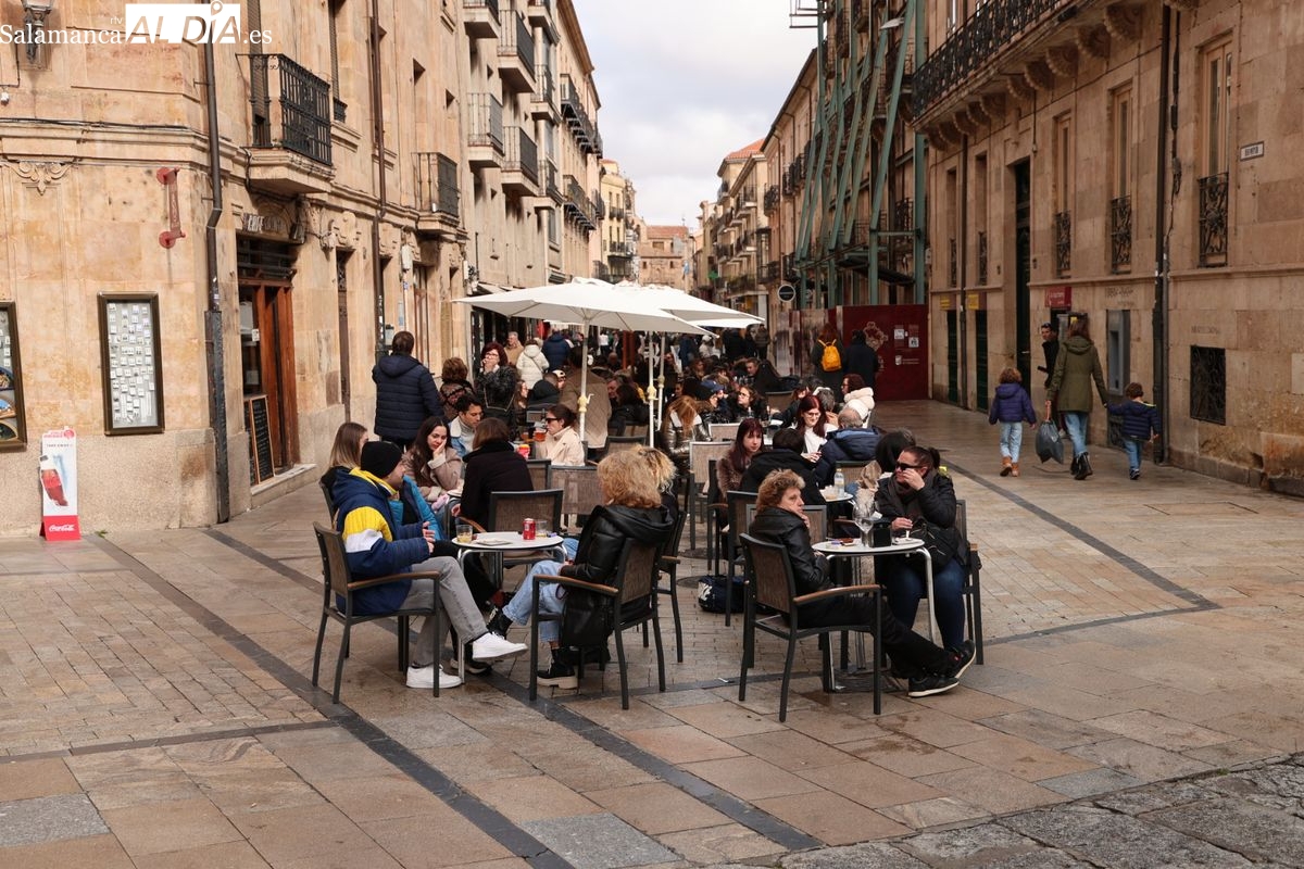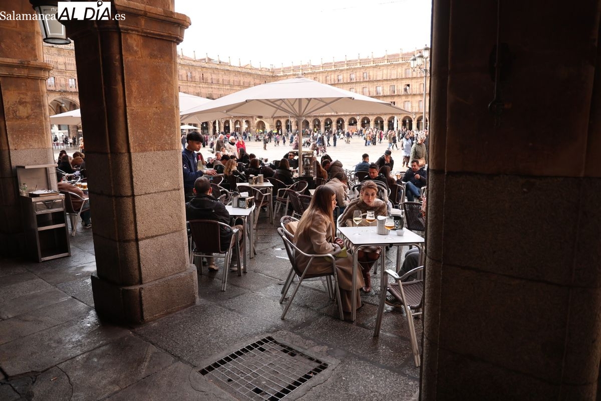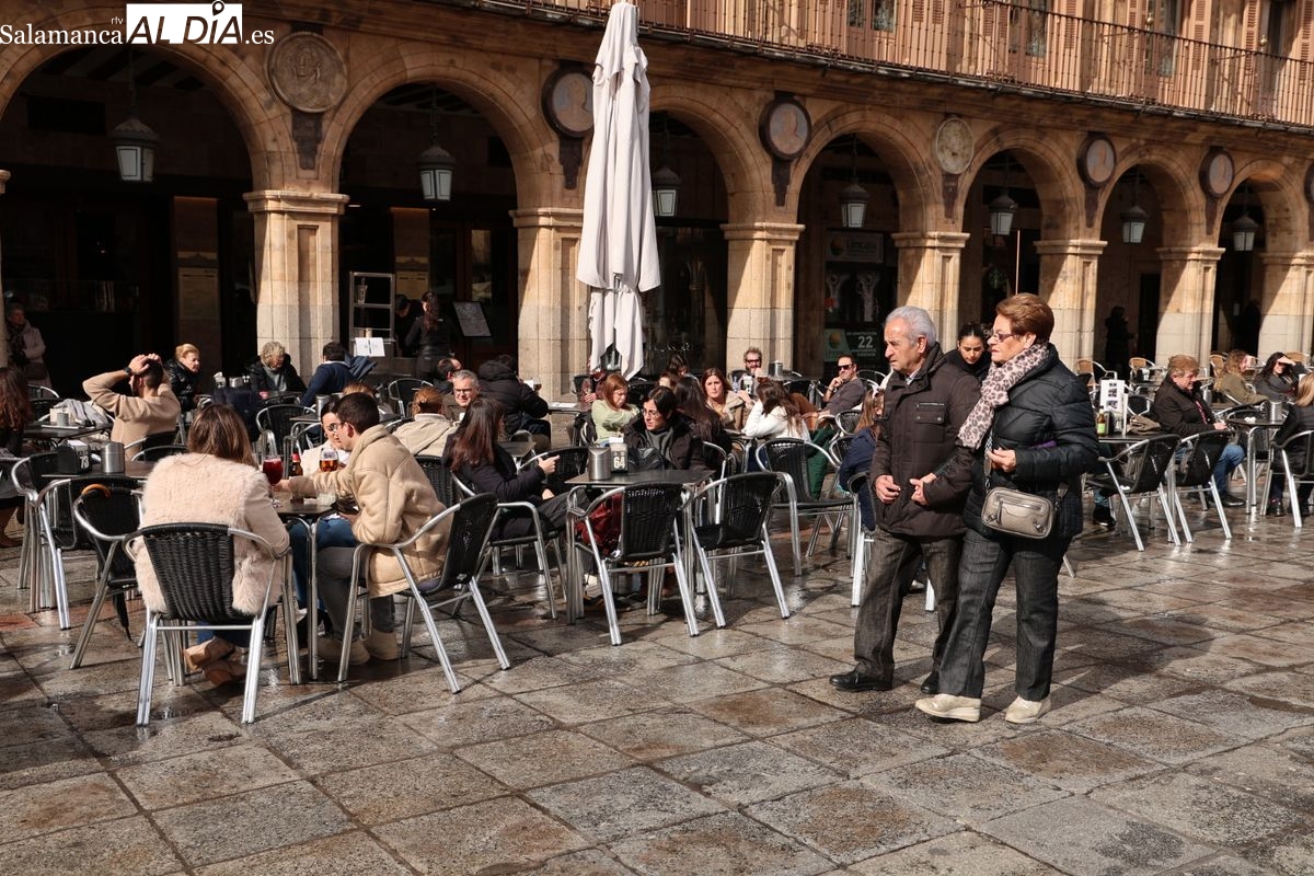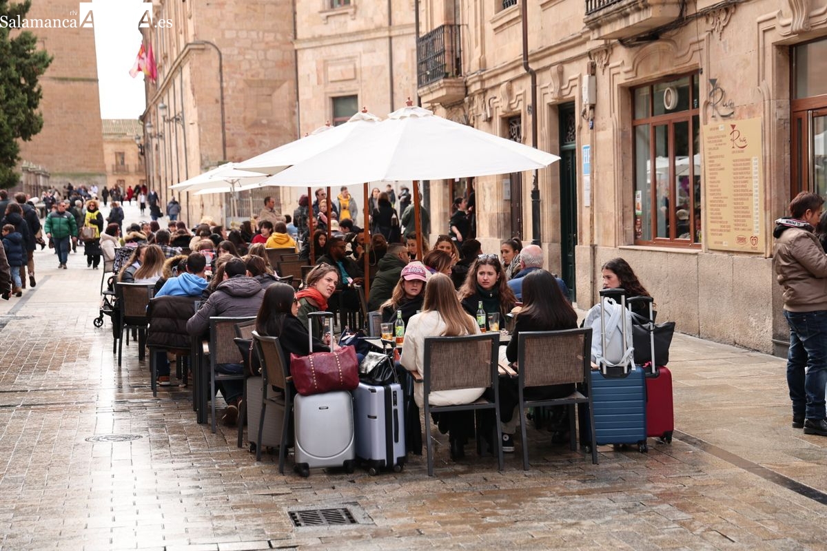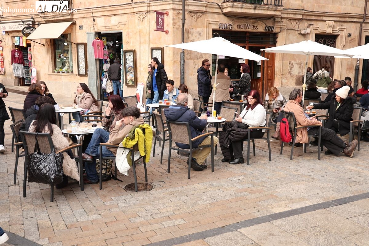 Pese a que el día ha amanecido con lluvia, al mediodía, la mejoría del tiempo, ha invitado a los salmantinos y turistas a pasear por el centro de la ciudad o tomar algo en las terrazas