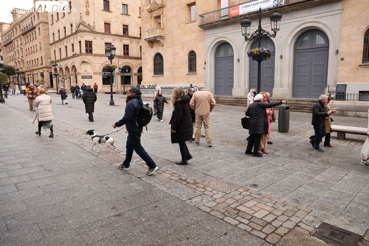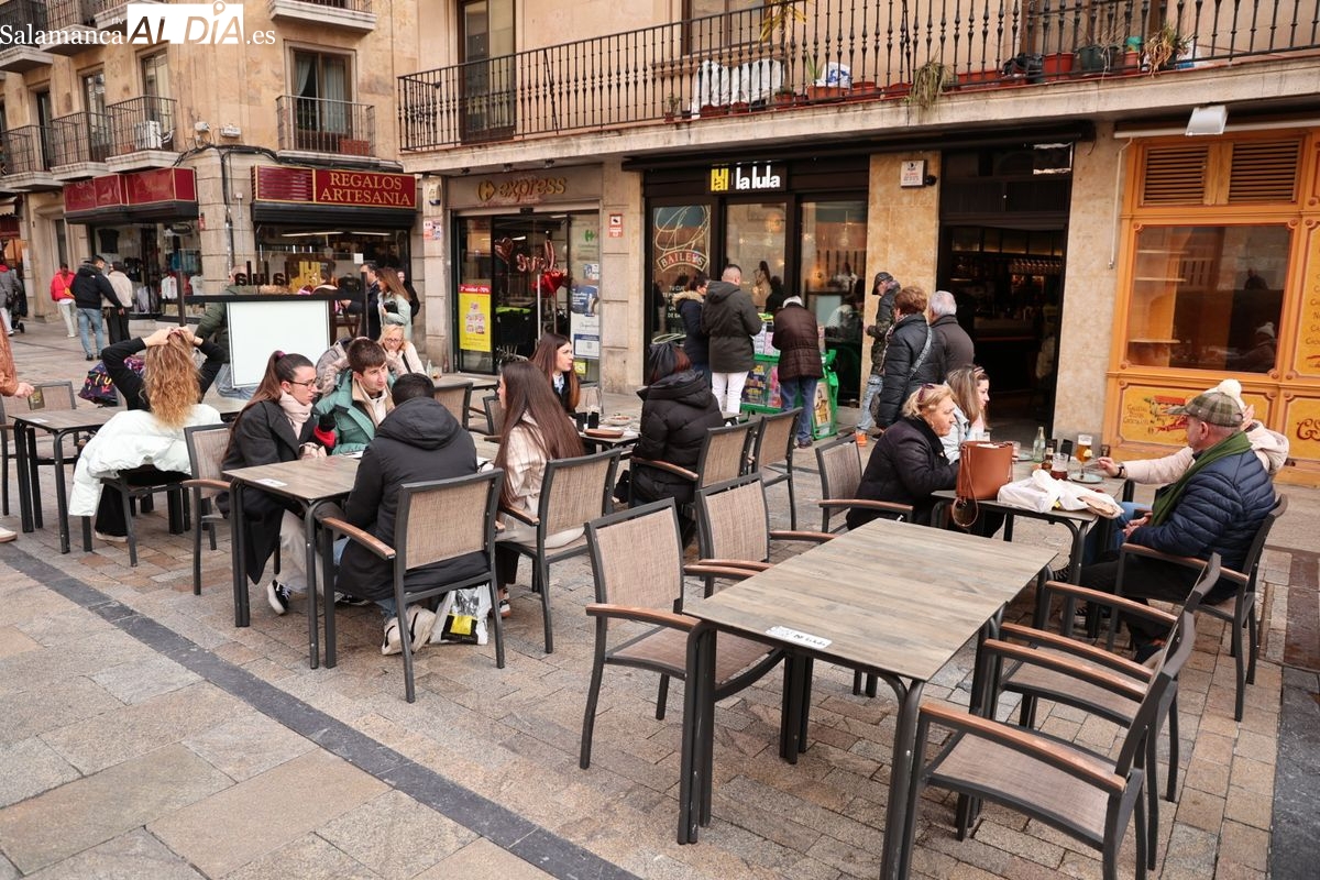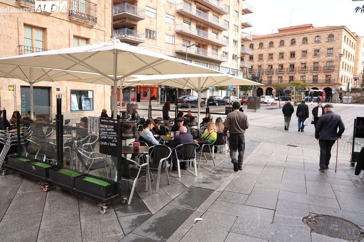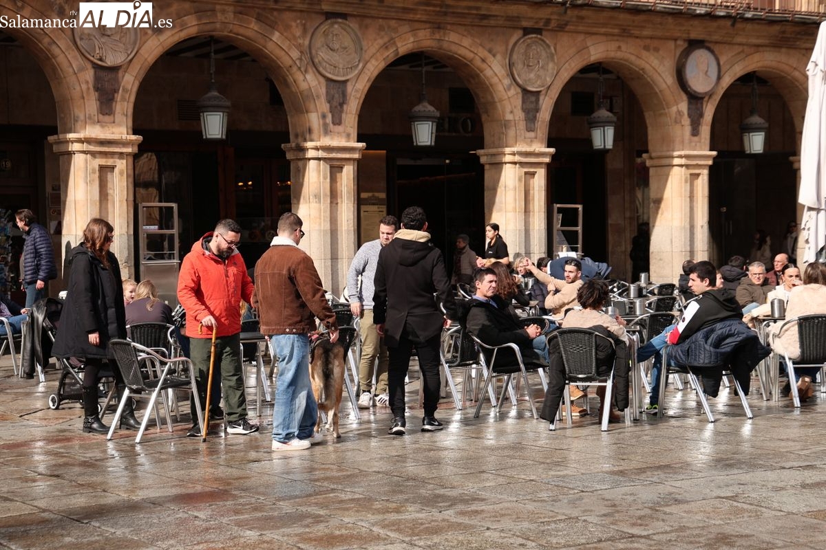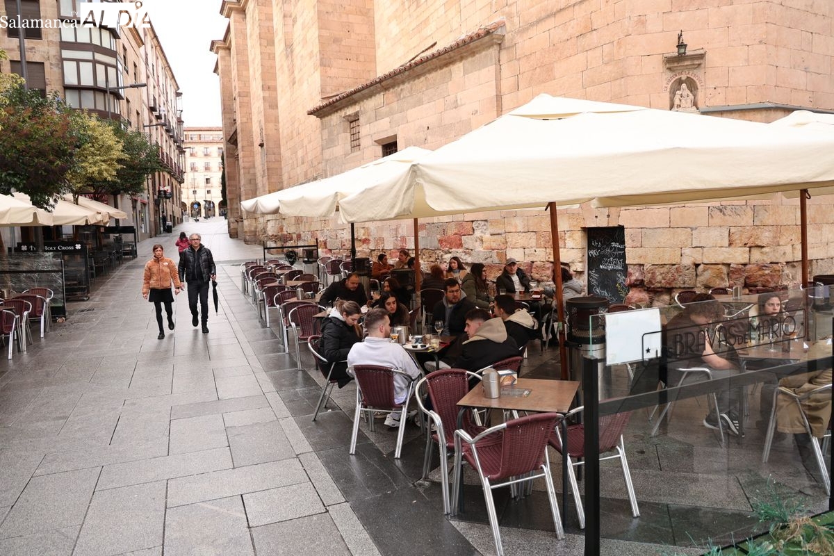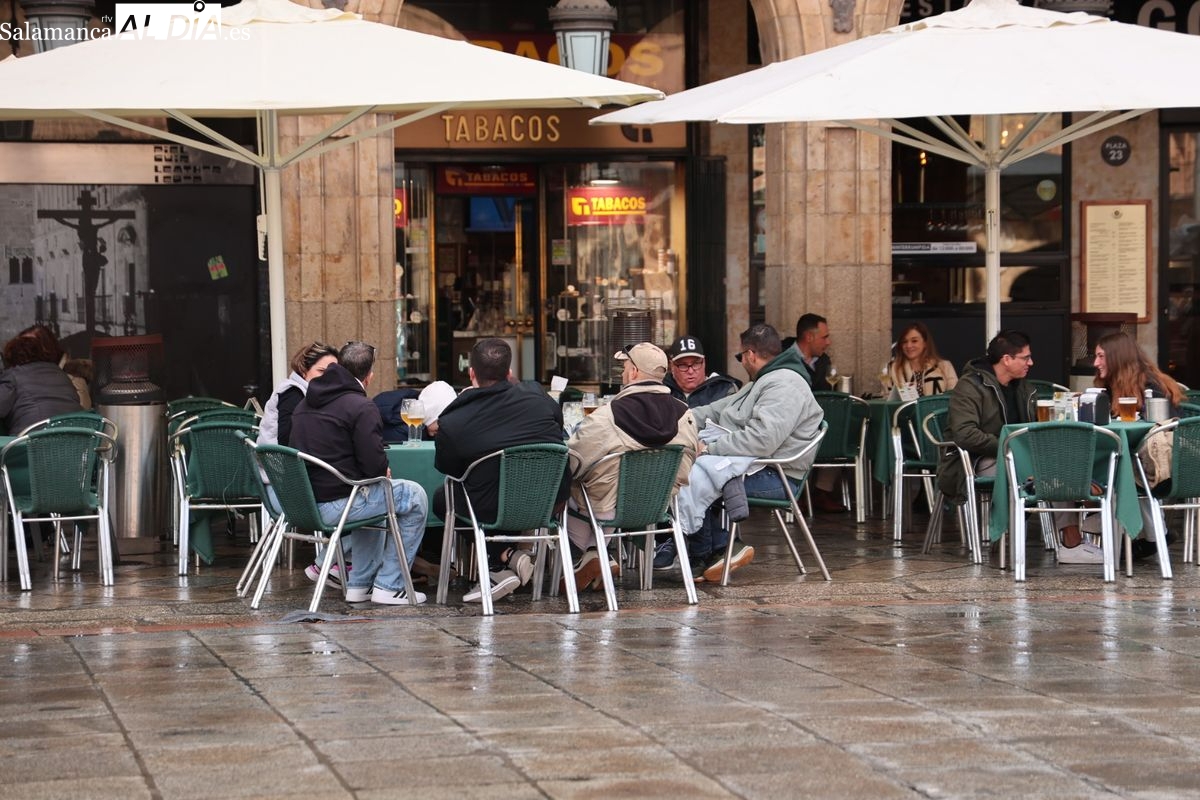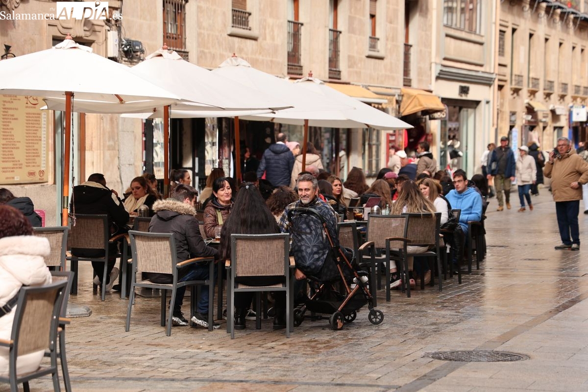 Pese a que el día ha amanecido con lluvia, al mediodía, la mejoría del tiempo, ha invitado a los salmantinos y turistas a pasear por el centro de la ciudad o tomar algo en las terrazas