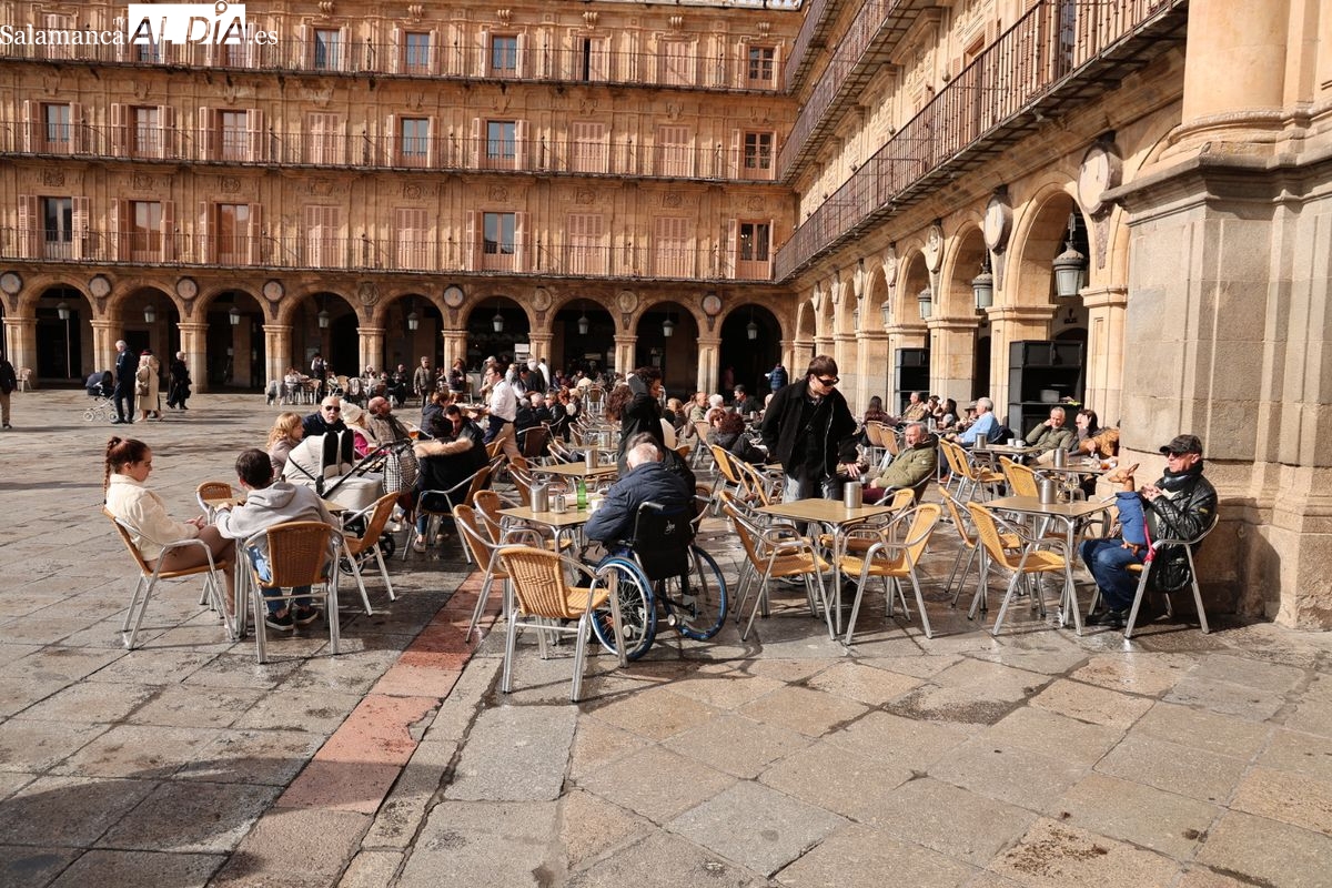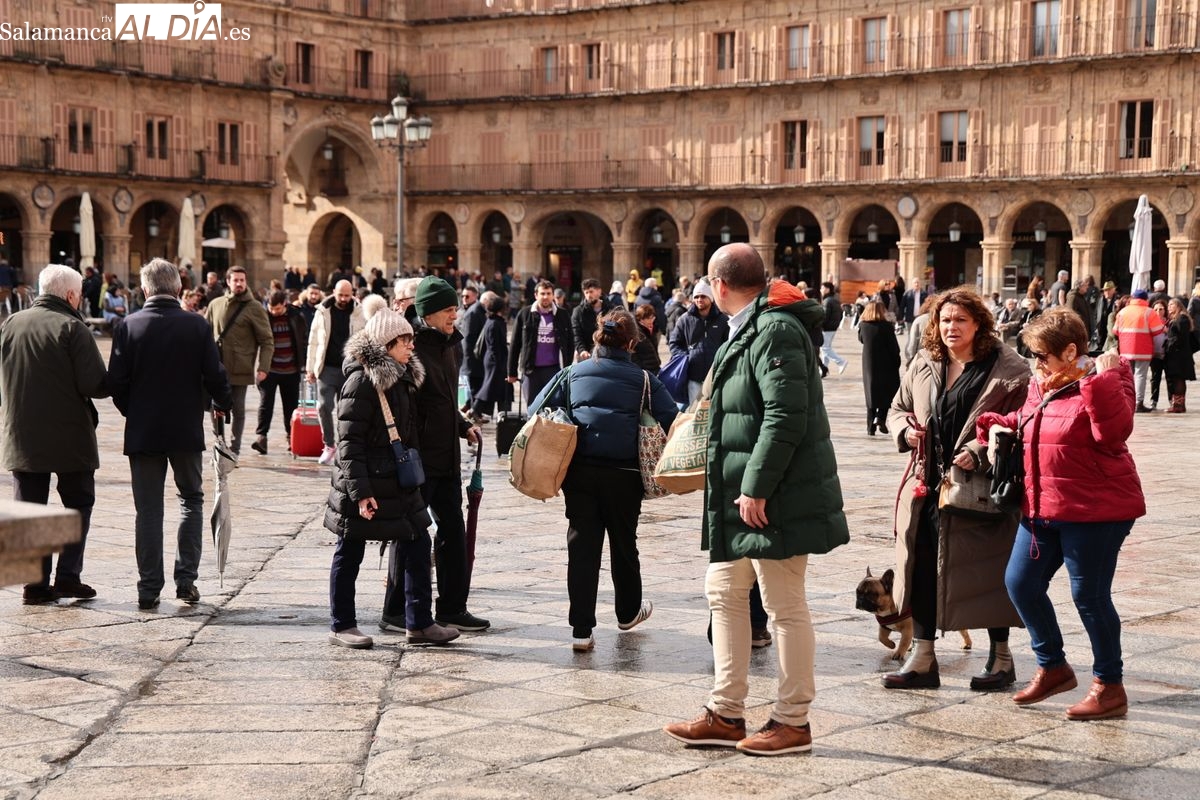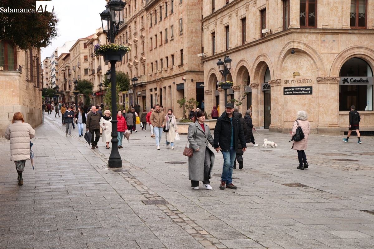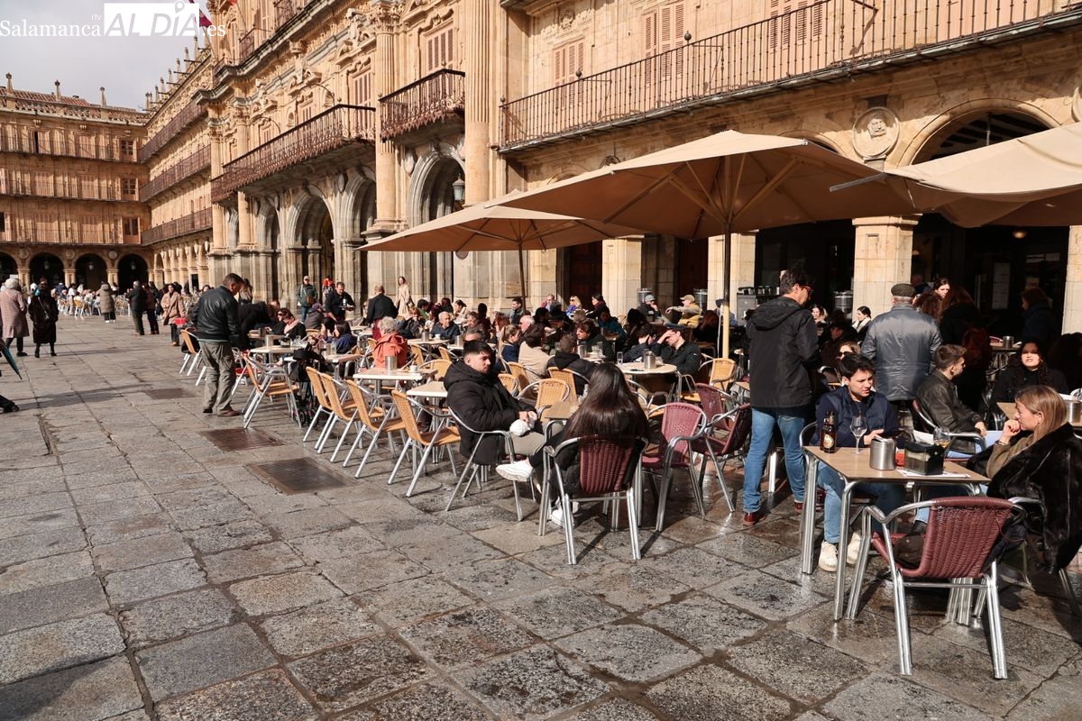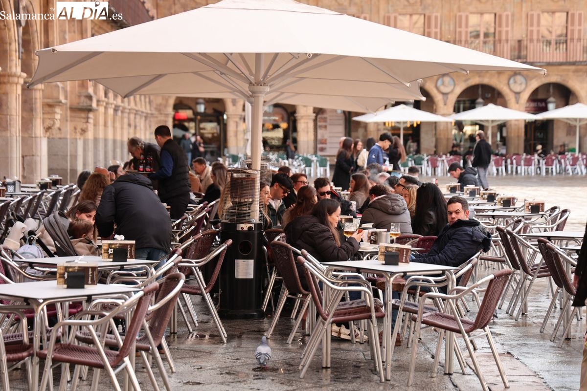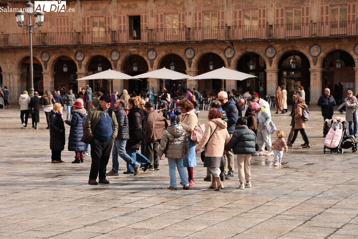 Pese a que el día ha amanecido con lluvia, al mediodía, la mejoría del tiempo, ha invitado a los salmantinos y turistas a pasear por el centro de la ciudad o tomar algo en las terrazas