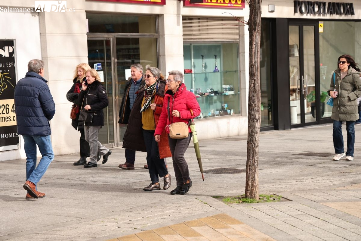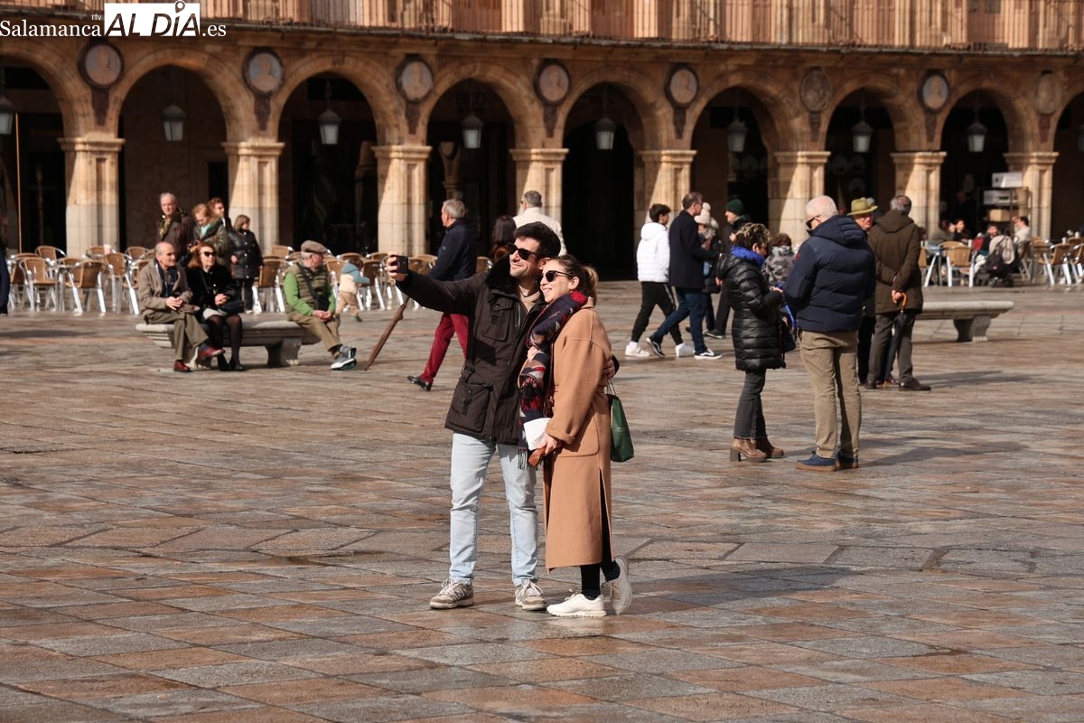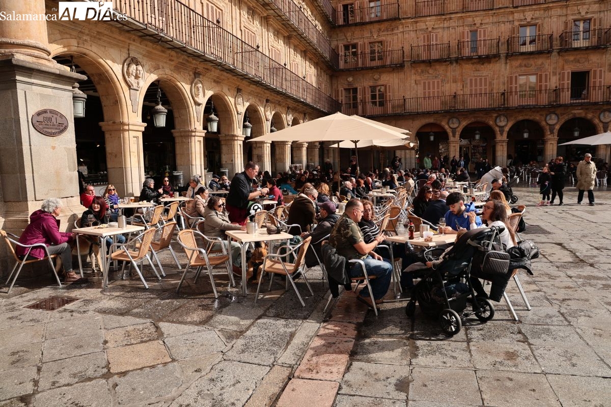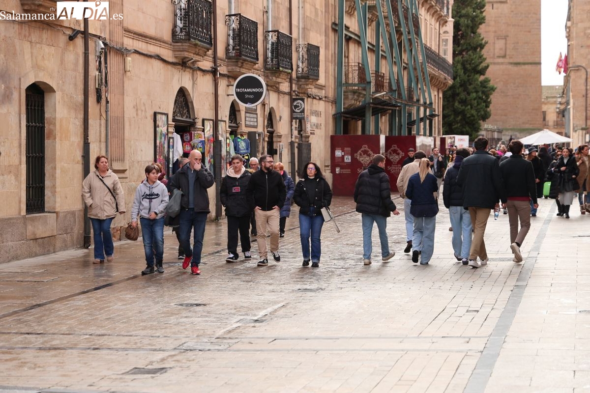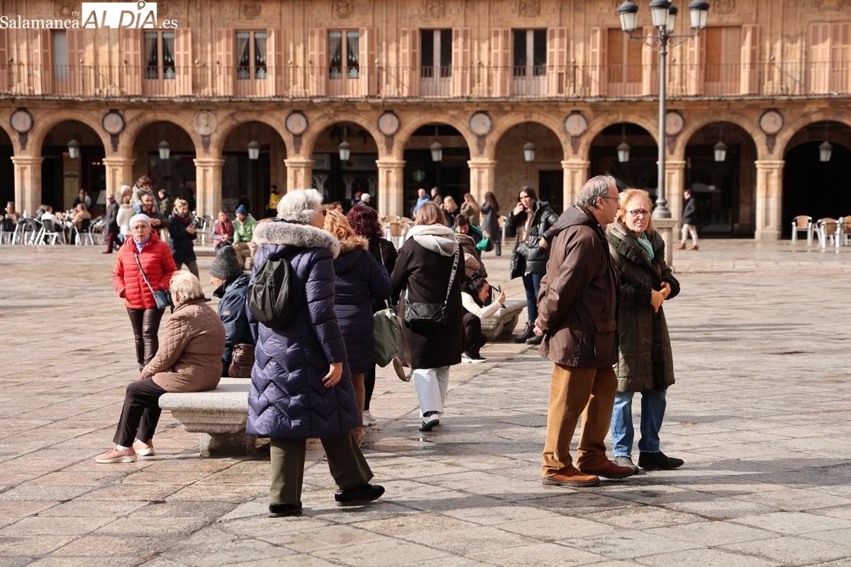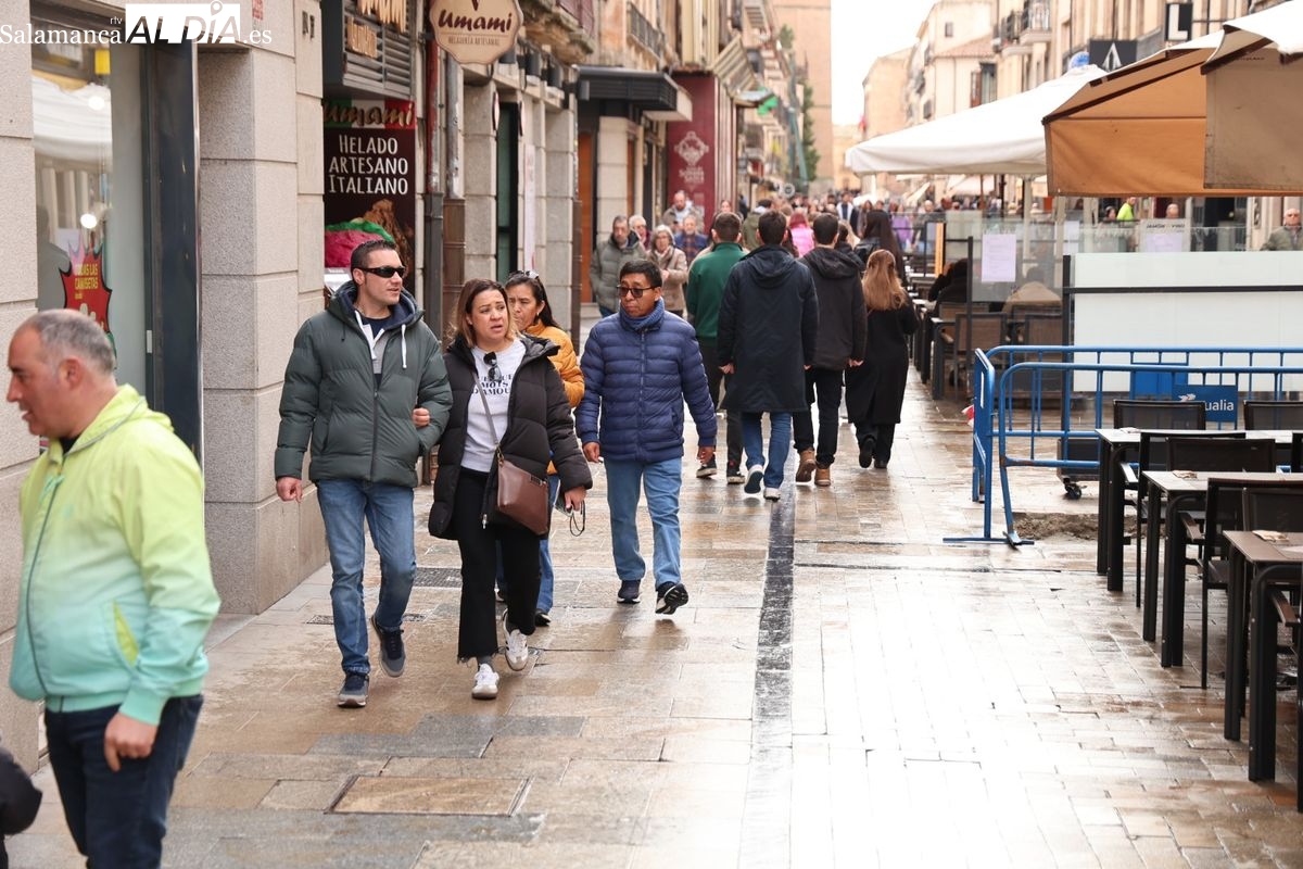 Pese a que el día ha amanecido con lluvia, al mediodía, la mejoría del tiempo, ha invitado a los salmantinos y turistas a pasear por el centro de la ciudad o tomar algo en las terrazas